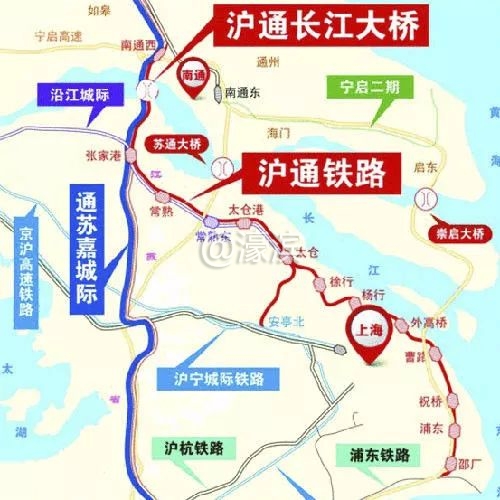 此外,沪通大桥作为公铁两用大桥,承担国家铁路、城际铁路、高速公路 三条通道。其中沪通铁路是长三角地区快速轨道交通网的重要组成部分,途经南通市,苏州市和上海市嘉定区。