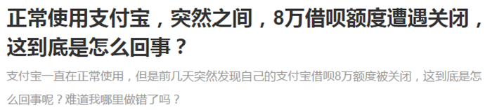 支付宝借呗突然被关闭,是怎么回事?欠的钱是不是不用还了? 如今这个互联网时代,什么东西都需要网络,只要有网络,什么都能解决,比如说手机,有了网络之后就可以看电视,玩游戏,还可以进行手机支付,说到手机支付,想必大家都在用支付宝和微信,其中用支付宝的人更多,因为里面有花呗、借呗的功能,可以提前消费,不过最近有网友在网上提问自己的支付宝借呗突然被关闭,是怎么回事?欠的钱是不是不用还了? 首先来回答下第一个问题,这位网友是8万额度的借呗被关了,可见资质条件不错,所以可以排除杠杆过高关闭的,一般来说只是降额,也就是说借呗被关闭应该是这位网友个人情况出现了问题,第一个原因,可能是系统问题,因为蚂蚁金服系统会经常维护升级,这个期间借呗是有可能短暂关闭的,没有额度也正常,可以第二天重新刷新,或者到官方看看公告。 第二个原因可能是使用借呗的过程中有违规行为,比如刷单,套利等等这些,要是被蚂蚁金服大数据读取到了,那么借呗就会被关闭了;第三个原因就是借呗出现了逾期和欠息的情况,或者是用户在银行出现逾期和欠息的情况,这样蚂蚁金服通过征信系统读取到信息,借呗也会被关闭;最后一个原因就是用户存在被执行、偷税漏税,讨债的情况,被读取到信息,借呗也会被关闭。 所以说要是借呗突然被关闭,可能就是出现了这些情况,自己可以查查有没有这么做。对于第二个问题,欠的钱肯定是要还的,不要想得太好,以为借呗关闭了就不用还钱了,马云作为商人可不是傻的,借呗关闭了,这个还款通道还是打开的,该还的钱一分都不能少,还有别以为卸载了支付宝就有用的,要知道如今是一个大数据时代。 当你用自己的身份证以及电话号码注册支付宝的时候,支付宝就已经记住你的相关信息了,要是你欠了钱不还,会成为老赖,支付宝的芝麻信用系统是和个人征信对接的,被查出来,那么以后就别想出远门了,因为坐不了火车和飞机,也会影响到你买车买房,毕竟现在个人的诚信是非常重要的。不管怎么样支付宝确实给我们提供了方便,所以还是要遵守它们的使用规则,不还钱心里也会不安不是吗?