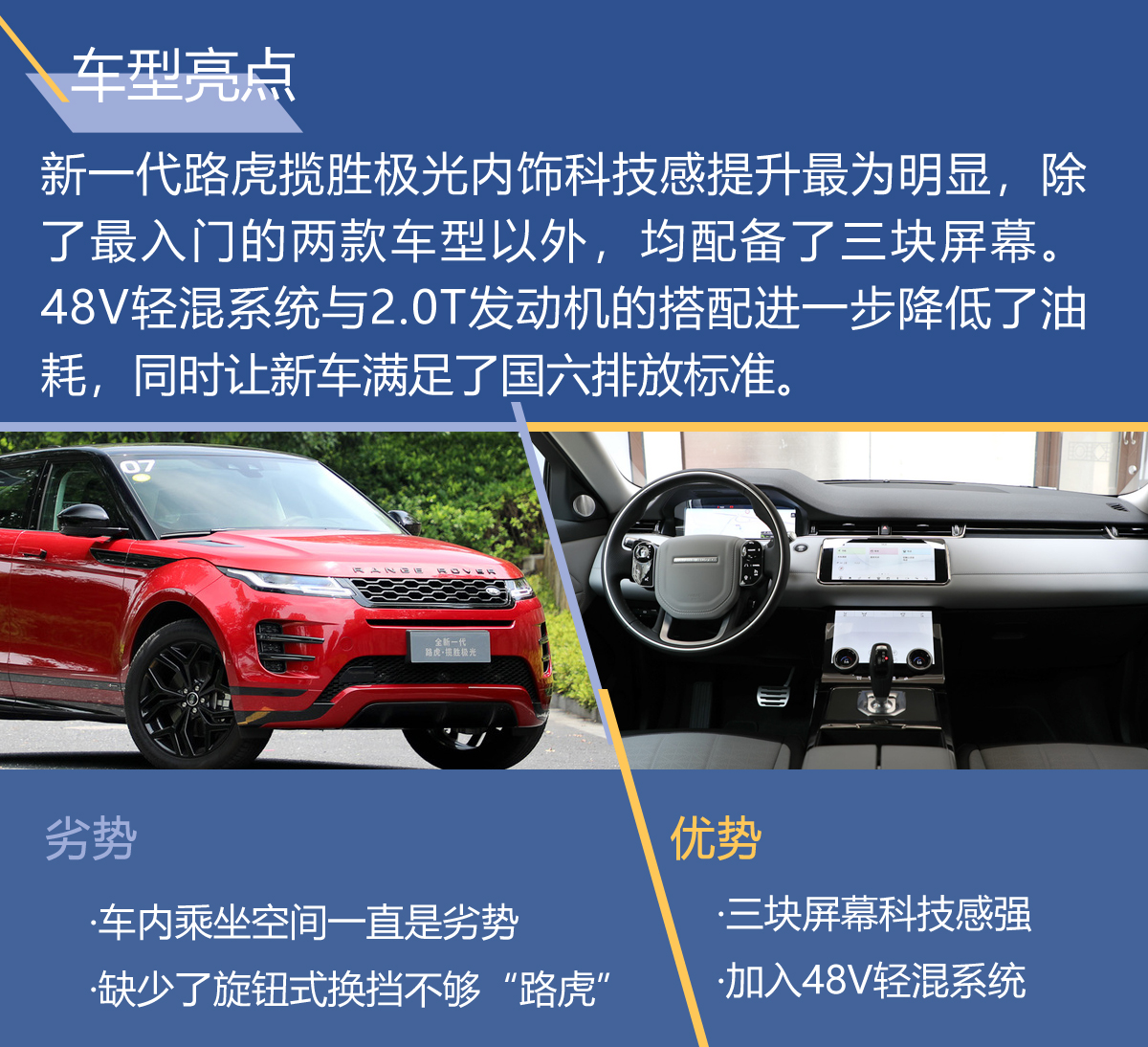 近日,我们从相关渠道获悉,全新一代路虎揽胜极光(参数|图片)将会在今晚于上海正式上市。新车采用了类似揽胜星脉(参数|图片)的前脸造型,并且在动力部分加入了48V轻混系统。在今年6月开幕的深港澳国际车展上,新一代揽胜极光公布了预售价格为35.9万元起,其中首发运动定制版预售价格为39.08万元。 新车升级亮点 1、全车灯组造型升级,采用隐藏式门把手 2、轴距小幅提升21mm,达到2681mm 3、换装12.3英寸全液晶仪表、双10.2英寸触控屏幕 4、首次加入ClearSight Grand View技术 5、2.0T发动机加入48V轻混系统 外观部分,新一代极光采用了最新的揽胜(参数|图片)家族设计语言,头灯变得非常锐利,内部结构也仿照星脉而来。黑色小尺寸倒梯形进气格栅,搭配头灯下方的进气口,是路虎家族标志性设计。 车身侧面整体线条变化不大,取消了黑色的轮眉,风格偏向城市SUV。双色车身设计保留了新鲜感,门把手升级成和星脉一样的隐藏式设计,也降低了风阻。轮毂的设计不够走心,造型没有换新,顶配车型采用的也是235/50 R20尺寸的轮胎。 尺寸方面,新车的长宽高为4371/1904/1649mm,几乎与现款车型持平。轴距为2681mm,相比现款车型小幅增加了21mm。 车尾部分,新一代揽胜极光同样采用狭长的灯组造型,与车头形成呼应。“RANGE ROVER”位于一对尾灯之间,更加醒目。保险杠造型进行了重新设计,双边共两出排气与车尾更贴合。 内饰部分,新一代揽胜极光依旧是模仿着星脉去塑造,相比上一代车型增加了一块屏幕,多功能方向盘的功能区换成了控制面板,更显科技感。新车终于加入了全液晶仪表,换挡机构也由之前的旋钮式换成了电子挡把。 配置部分,流媒体后视镜对于揽胜极光来说是全新的配置,但放眼整个汽车市场来看,流媒体后视镜不但实用性差,并且也算不上新潮的配置了。 新车还首次采用了ClearSight Grand View技术,可以显示车前180°视觉盲区的路面影响,形象的说,就是整个发动机舱变为透明的,更利于车辆爬坡状态下进行路况观测。 动力部分,新一代揽胜极光基于PTA横置发动机平台打造,依旧是捷豹和路虎共用的2.0T发动机,只不过这次加入了48V轻混系统,调教后提供249马力和365牛·米的账面数据。传动部分,新车采用了9速手自一体变速箱。 底盘方面,前悬架依旧是麦弗逊结构,后悬架加入了H型下控制臂,稳定性得到了提升。新车还升级了第二代智能全地形反馈适应系统,在越野性能方面得到了加强。 虽然揽胜极光定位豪华中型SUV,但是从中国消费者对于路虎品牌的认可度来说并不及奥迪和奔驰,原本与揽胜极光价格重叠的奥迪Q5L(参数|图片)和奔驰GLC-L也在加长车身后与路虎揽胜极光在销量上拉开了更大的距离。比较接地气的沃尔沃和凯迪拉克在销量上也都有着不错的表现,而揽胜极光也只能与英菲尼迪QX50(参数|图片)在销量上互相鼓励。 全文总结:新一代路虎揽胜极光模仿揽胜星脉的内饰设计确实带来了更多豪华感和科技感,但是空间依旧成为了短板,这也是揽胜极光的特点之一,强调豪华感的同时给予你不太实用的空间。越野能力的提升表现在ClearSight Grand View技术的应用,虽然揽胜极光并不把越野当成主要工作,但是如果没了这项技能,新车的卖点就更少了。