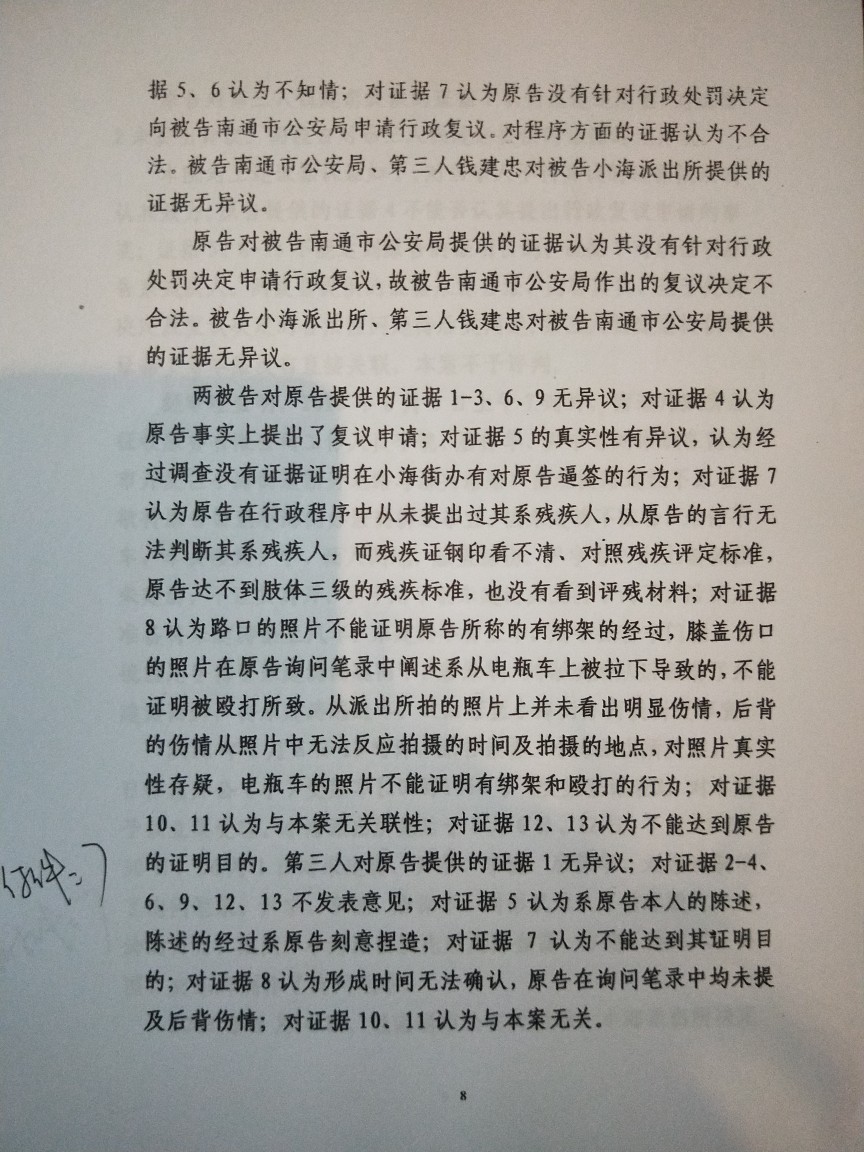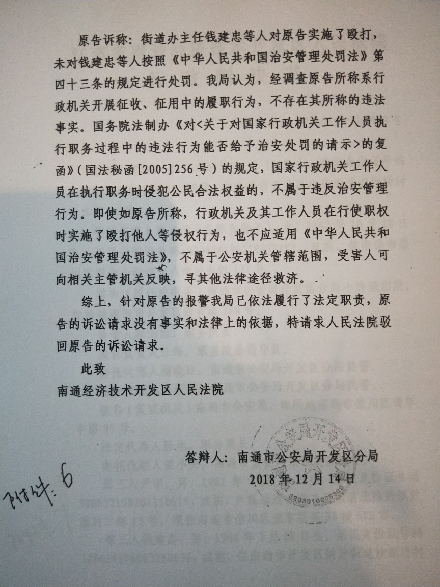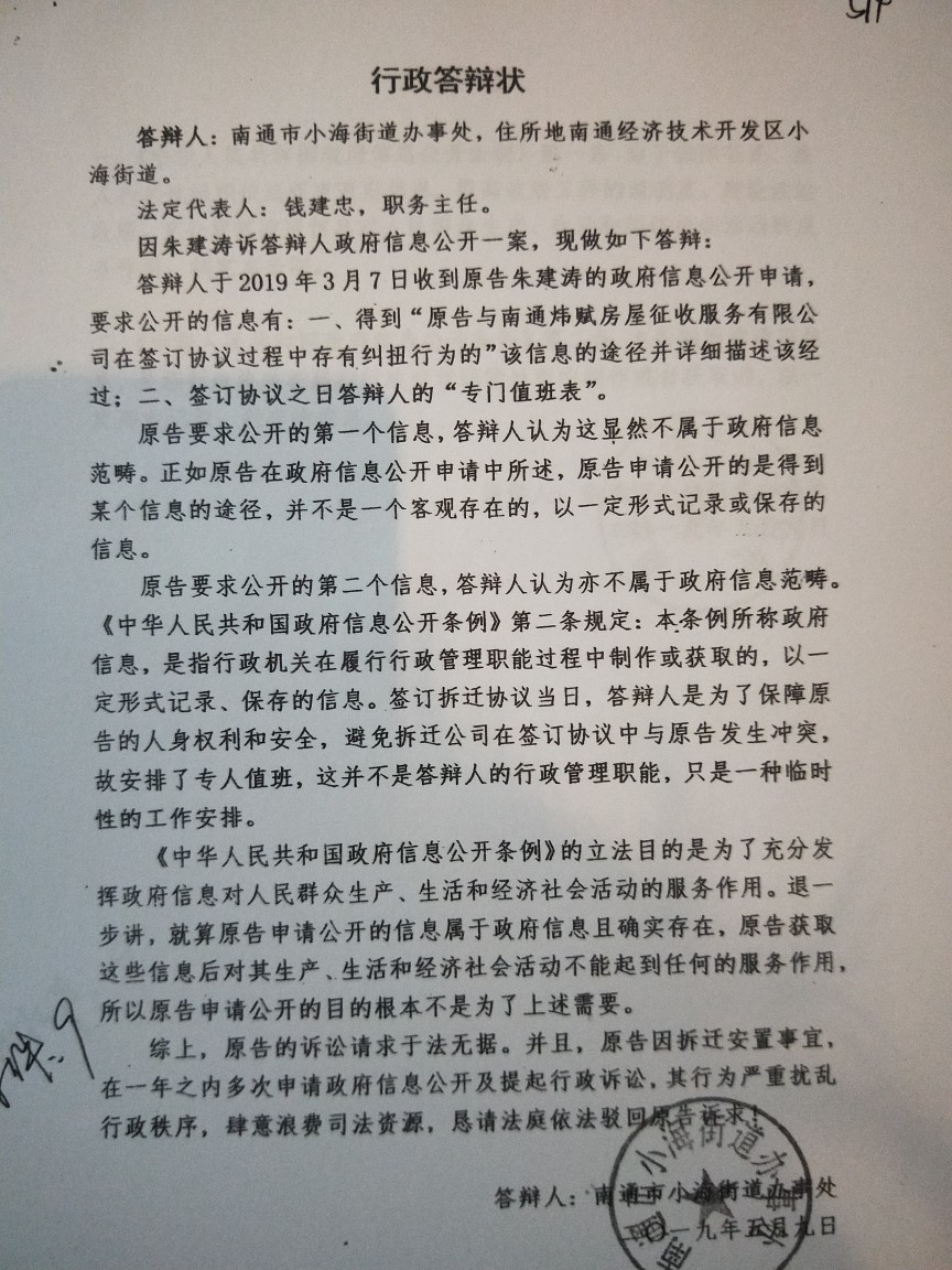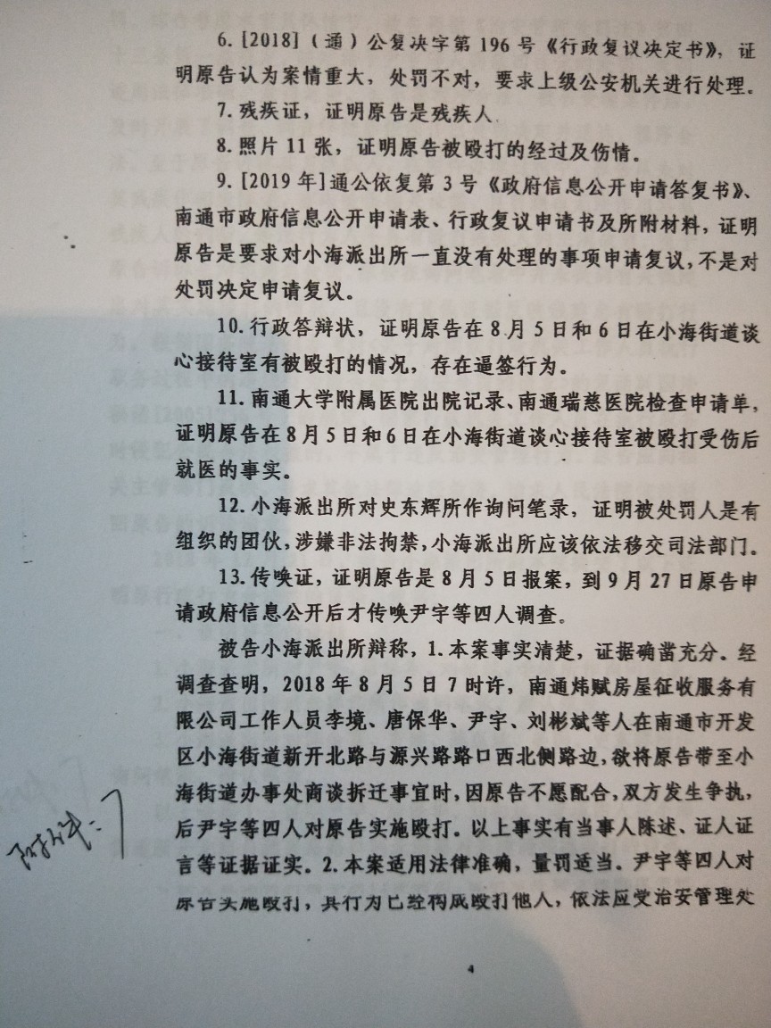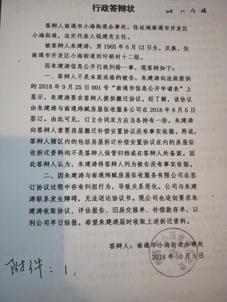 附件:1,小海街办2018年10月5日制作的《行政答辩状》 2,案号(2019)苏0691行初594号开庭笔录第三页 3,案号(2018)苏0691行初703号开庭笔录第十五页 4,案号(2018)苏0691行初703号笔录十四页 5,案号(2019)苏06行终172号《谈话笔录》 6,南通市公安局开发区分局2018年12月14日《行政诉讼答辩状》 7,案号(2018)苏0691行初703号《行政判决书》 8,南通市公安局开发区分局2019年5月9日制作的《行政答辩状》 9小海街办2019年5月9日制作的《行政答辩状》