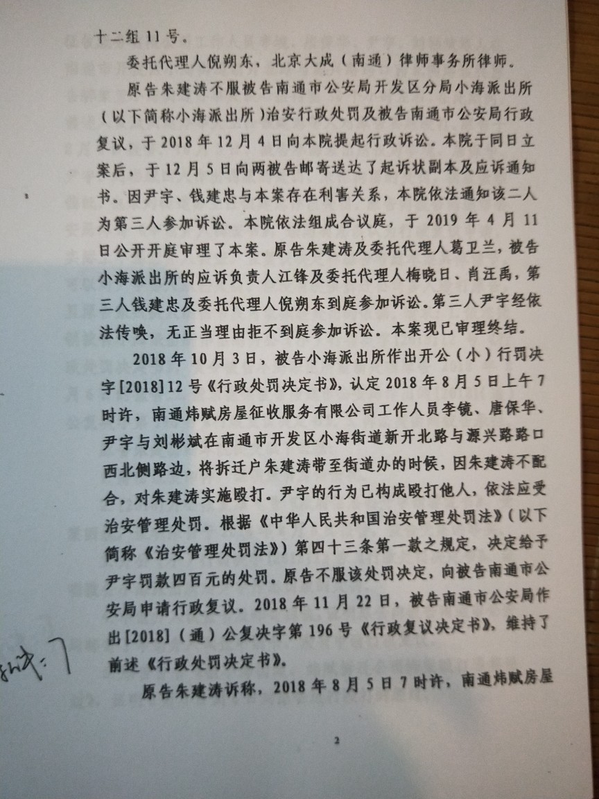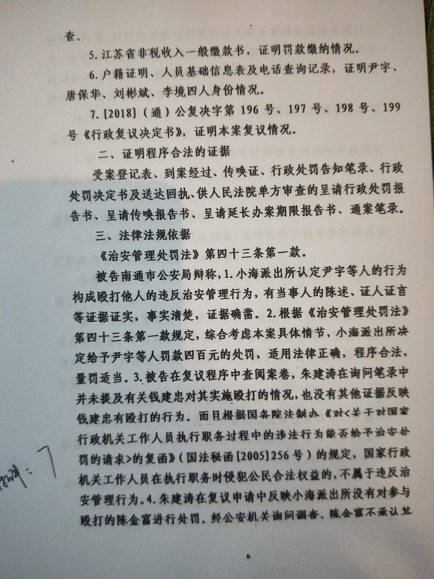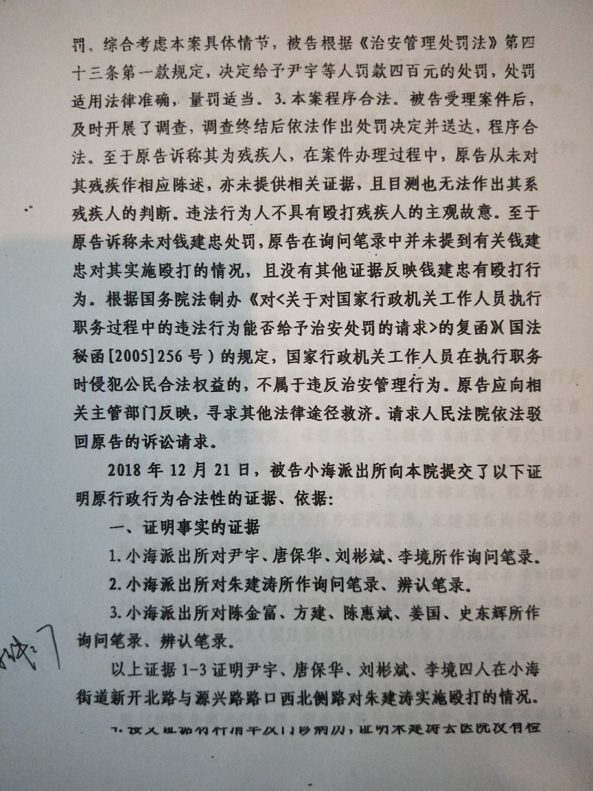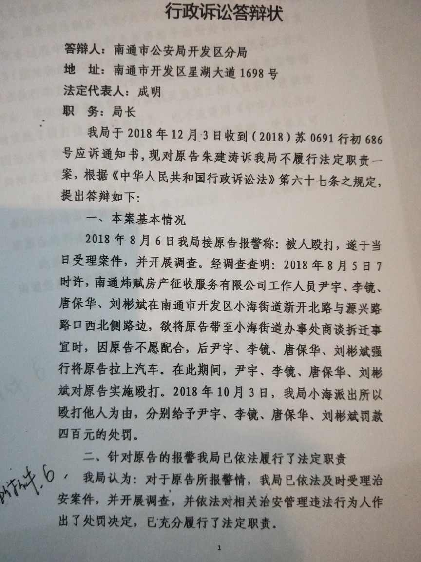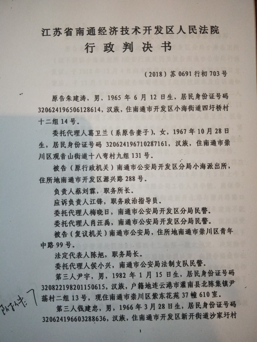 附件:1,小海街办2018年10月5日制作的《行政答辩状》 2,案号(2019)苏0691行初594号开庭笔录第三页 3,案号(2018)苏0691行初703号开庭笔录第十五页 4,案号(2018)苏0691行初703号笔录十四页 5,案号(2019)苏06行终172号《谈话笔录》 6,南通市公安局开发区分局2018年12月14日《行政诉讼答辩状》 7,案号(2018)苏0691行初703号《行政判决书》 8,南通市公安局开发区分局2019年5月9日制作的《行政答辩状》 9小海街办2019年5月9日制作的《行政答辩状》
