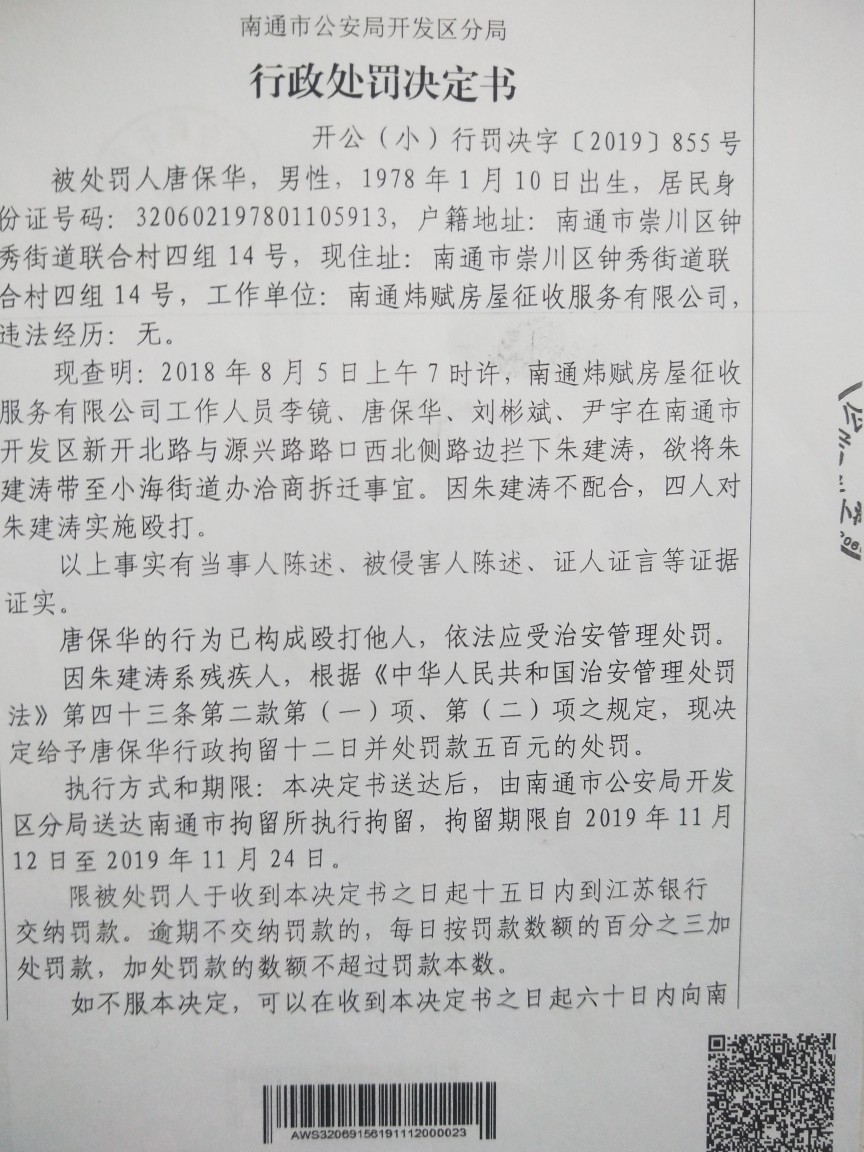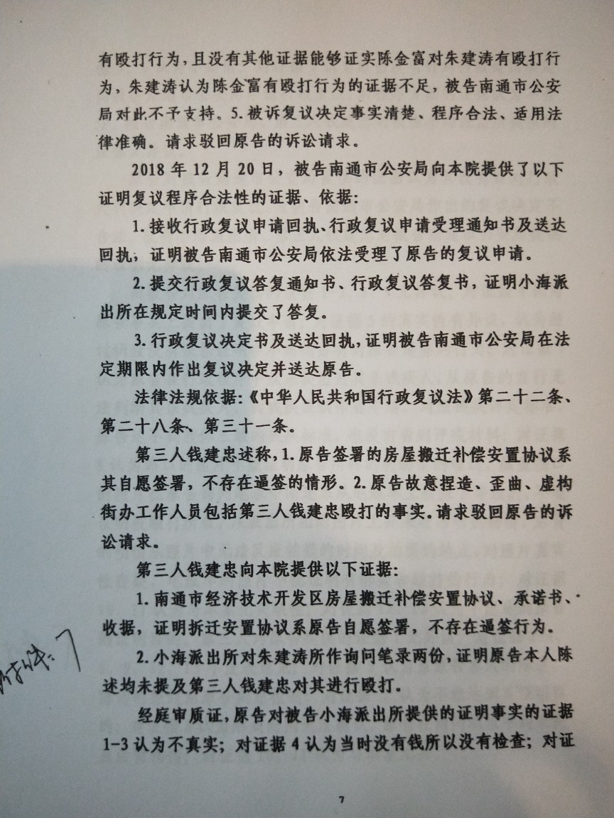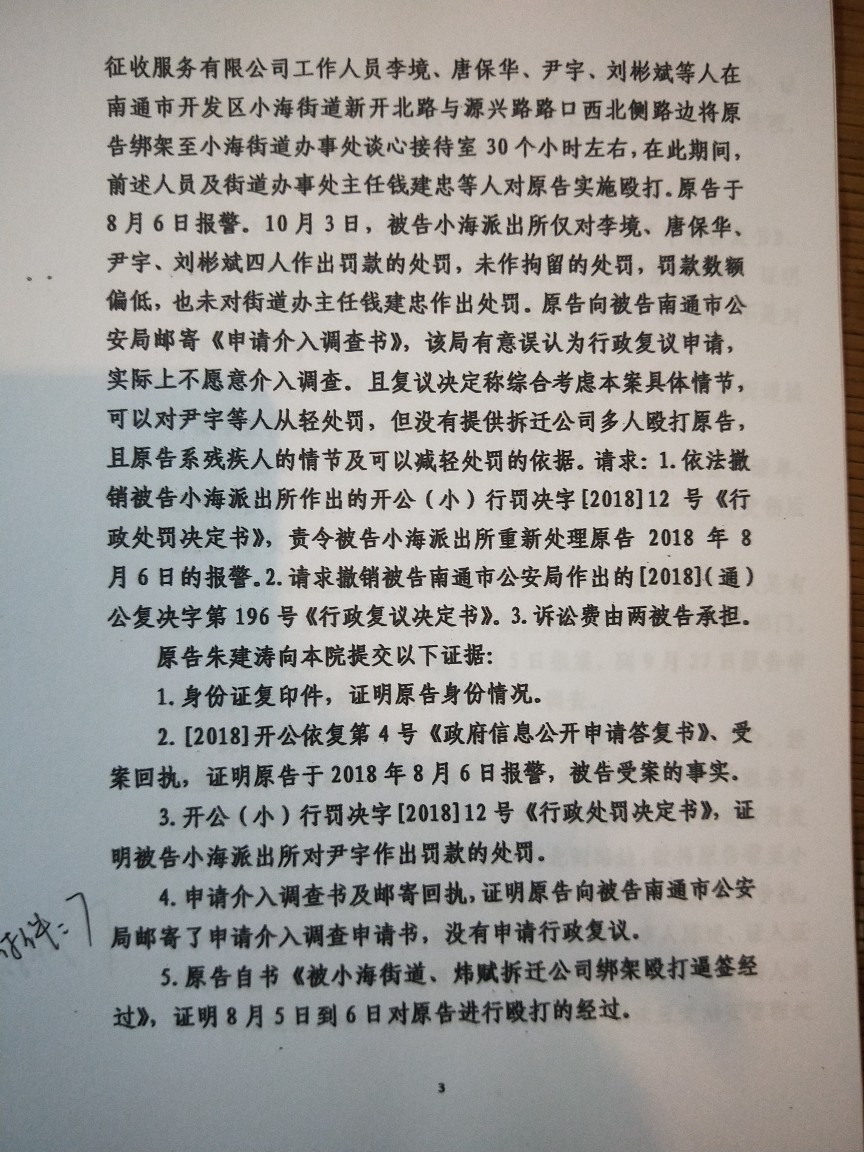 实施暴力逼签南通公安成保护伞 首先看看江苏省南通经济技术开发区人民法院行政判决书(2018)苏0691行初703号的描述:“经审理查明,2018年8月5日上午7时许,南通炜赋房屋征收服务有限公司工作人员李x、唐xx、尹x与刘xx在南通市开发区小海街道新开北路与源兴路路ロ西北侧路边拦下原告,欲将原告带至小海街办洽商拆迁事宜,因朱xx不配合,未停下车,车头碰到尹x,两人倒地,膝盖擦伤。尹x等四人上前抓住朱xx,不让其离开,尹x用手朝朱xx头上打了两下,后四人准备将朱xx抬上汽车,朱xx不肯上车,用手抓着车门框,李x就用手打了朱xx的腿两下,唐xx、刘xx则从后面踢了朱xx两脚,将朱xx踢进车,之后带至小海街办商谈拆迁事宜。”从小海街办主任钱xx的言行及小海派出所作出的行政处罚决定及其对“带至小海街办”后的避而不谈、开发区公安局为犯罪嫌疑人辩护和南通市公安局在没有申请书的情况下作出维持的行政复议决定,可以看出这是一起由小海街办主任钱xx组织的黑社会性质的犯罪集团实施暴力逼签事件,南通公安在这件事上成保护伞。 南通炜赋房屋征收服务有限公司的这帮人,【实际上有20几个人】对朱xx实施了非法拘禁。首先“拦下原告”在“朱xx不配合”“朱xx不肯上车”的情形下“将朱xx踢进车,之后【强制】带至小海街办,”在车上除不断殴打外还威胁说拉到长江边上去打,打完扔到长江里。在小海街办谈心接待室【里面有监控】,朱xx受到继续毒打,用湿毛巾抽,打嘴巴等各种残酷的折磨。【附件:1小海街办2018年10月5日制作的《行政答辩状》称“因朱xx与南通炜赋房屋征收服务有限公司在签订协议过程中存有纠扭行为,导致关系恶化。”】在这期间,小海街办为了“还排了专门的值班表,”“每组四五个人”对朱xx实施非法拘禁30多个小时【附件:2案号(2019)苏0691行初594号开庭笔录第三页倒数第六行被代:“就安排了相关人员进行排班,那次谈了30多个小时”】。该绑架、殴打并非法拘禁朱xx的组织者小海街办主任钱xx也当庭承认其夜里2点到过现场,即其亲自参加了非法拘禁朱xx【附件:3案号(2018)苏0691行初703号开庭笔录,第十五页倒数第十三行钱xx说:“8月6日凌晨2点的样子进去过,”】并且当庭否认监控视频的存在【谈心接待室的监控视频是他们的犯罪证据,也是逼签的经过,主任钱xx在(2018)苏0691行初703号笔录14页第六行中说要搬迁监控坏了。案号(2019)苏行终172号《谈话笔录》【附件:5】却能证实该视频是存在的,说明钱xx当庭隐匿证据】。 南通公安是这次黑除势力的保护伞。这样的行为明显构成犯罪且属于目前扫黑除恶专项斗争应该打击的对象。 2018年8月6日13时许,朱xx报警。小海派出所在朱xx做了相关信息公开后才于2018年10月1日紧急对四个犯罪嫌疑人【李x、唐xx、尹x与刘xx】制作了询问笔录,并于2018年10月3日,作出从轻处罚的决定。对其他参加非法拘禁的犯罪嫌疑人【大部分是干部】不管不问,开发区公安局还为犯罪嫌疑人辩护【附件:6南通市公安局开发区分局2018年12月14日《行政诉讼答辩状》明明是犯罪行为,他们认为是违法行为。】使其逍遥法外。南通市公安局在没有收到行政复议申请的情况下,急匆匆作出维持小海派出所决定的行政复议决定,明显就是掩盖下级不作为的行为。【附件:7案号(2018)苏0691行初703号:“在实体审理上,未对小海派出所适用法律错误予以纠正,故复议决定应一并纠正。”】南通公安对钱xx当庭隐匿证据行为是明知的,他们有执法记录仪的证据也不使用【附件:8南通市公安局开发区分局2019年5月9日制作的《行政答辩状》】,更不追查。 综上所述,“建立大东亚共荣圈”不能掩盖小日本的侵略;“为了婴儿能有更好的生活”不能掩盖贩卖婴儿;“为了保障原告(朱xx)的人生权利和安全”【附件:9小海街办2019年5月9日制作的《行政答辩状》】同样不能掩盖非法拘禁。钱xx为了升官,同时也为了对朱xx的部分财产进行抢劫【对朱xx的厂房等没有补偿】组织了黑除势力对其实施了绑架、殴打、非法拘禁并逼签,南通公安的犯罪的证据不追查,对犯罪嫌疑人也不控制,更不按照刑事案件办理,明显成为违法犯罪的保护伞。