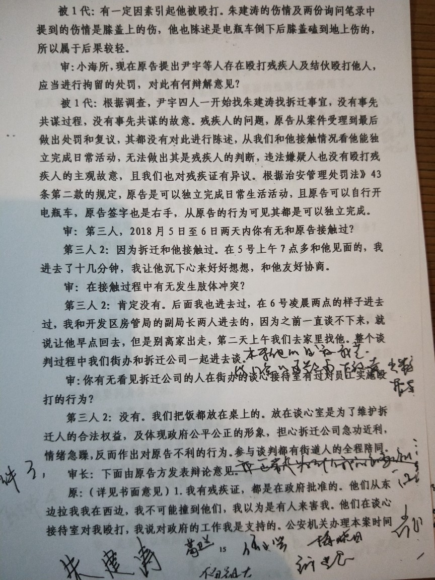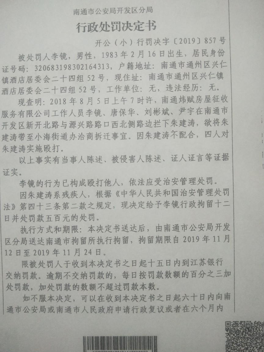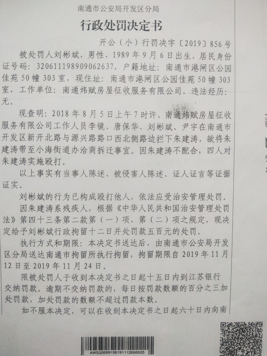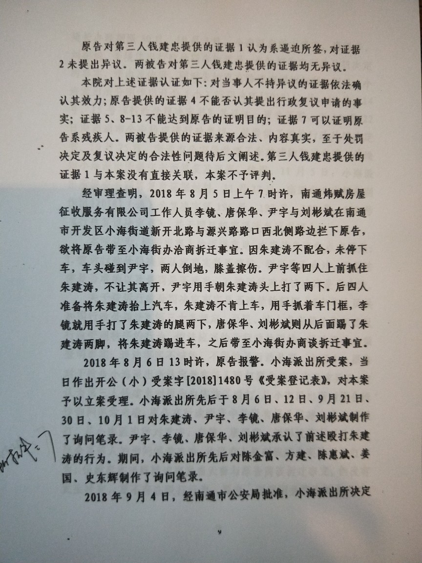 实施暴力逼签南通公安成保护伞 首先看看江苏省南通经济技术开发区人民法院行政判决书(2018)苏0691行初703号的描述:“经审理查明,2018年8月5日上午7时许,南通炜赋房屋征收服务有限公司工作人员李x、唐xx、尹x与刘xx在南通市开发区小海街道新开北路与源兴路路ロ西北侧路边拦下原告,欲将原告带至小海街办洽商拆迁事宜,因朱xx不配合,未停下车,车头碰到尹x,两人倒地,膝盖擦伤。尹x等四人上前抓住朱xx,不让其离开,尹x用手朝朱xx头上打了两下,后四人准备将朱xx抬上汽车,朱xx不肯上车,用手抓着车门框,李x就用手打了朱xx的腿两下,唐xx、刘xx则从后面踢了朱xx两脚,将朱xx踢进车,之后带至小海街办商谈拆迁事宜。”从小海街办主任钱xx的言行及小海派出所作出的行政处罚决定及其对“带至小海街办”后的避而不谈、开发区公安局为犯罪嫌疑人辩护和南通市公安局在没有申请书的情况下作出维持的行政复议决定,可以看出这是一起由小海街办主任钱xx组织的黑社会性质的犯罪集团实施暴力逼签事件,南通公安在这件事上成保护伞。 南通炜赋房屋征收服务有限公司的这帮人,【实际上有20几个人】对朱xx实施了非法拘禁。首先“拦下原告”在“朱xx不配合”“朱xx不肯上车”的情形下“将朱xx踢进车,之后【强制】带至小海街办,”在车上除不断殴打外还威胁说拉到长江边上去打,打完扔到长江里。在小海街办谈心接待室【里面有监控】,朱xx受到继续毒打,用湿毛巾抽,打嘴巴等各种残酷的折磨。【附件:1小海街办2018年10月5日制作的《行政答辩状》称“因朱xx与南通炜赋房屋征收服务有限公司在签订协议过程中存有纠扭行为,导致关系恶化。”】在这期间,小海街办为了“还排了专门的值班表,”“每组四五个人”对朱xx实施非法拘禁30多个小时【附件:2案号(2019)苏0691行初594号开庭笔录第三页倒数第六行被代:“就安排了相关人员进行排班,那次谈了30多个小时”】。该绑架、殴打并非法拘禁朱xx的组织者小海街办主任钱xx也当庭承认其夜里2点到过现场,即其亲自参加了非法拘禁朱xx【附件:3案号(2018)苏0691行初703号开庭笔录,第十五页倒数第十三行钱xx说:“8月6日凌晨2点的样子进去过,”】并且当庭否认监控视频的存在【谈心接待室的监控视频是他们的犯罪证据,也是逼签的经过,主任钱xx在(2018)苏0691行初703号笔录14页第六行中说要搬迁监控坏了。案号(2019)苏行终172号《谈话笔录》【附件:5】却能证实该视频是存在的,说明钱xx当庭隐匿证据】。 南通公安是这次黑除势力的保护伞。这样的行为明显构成犯罪且属于目前扫黑除恶专项斗争应该打击的对象。 2018年8月6日13时许,朱xx报警。小海派出所在朱xx做了相关信息公开后才于2018年10月1日紧急对四个犯罪嫌疑人【李x、唐xx、尹x与刘xx】制作了询问笔录,并于2018年10月3日,作出从轻处罚的决定。对其他参加非法拘禁的犯罪嫌疑人【大部分是干部】不管不问,开发区公安局还为犯罪嫌疑人辩护【附件:6南通市公安局开发区分局2018年12月14日《行政诉讼答辩状》明明是犯罪行为,他们认为是违法行为。】使其逍遥法外。南通市公安局在没有收到行政复议申请的情况下,急匆匆作出维持小海派出所决定的行政复议决定,明显就是掩盖下级不作为的行为。【附件:7案号(2018)苏0691行初703号:“在实体审理上,未对小海派出所适用法律错误予以纠正,故复议决定应一并纠正。”】南通公安对钱xx当庭隐匿证据行为是明知的,他们有执法记录仪的证据也不使用【附件:8南通市公安局开发区分局2019年5月9日制作的《行政答辩状》】,更不追查。 综上所述,“建立大东亚共荣圈”不能掩盖小日本的侵略;“为了婴儿能有更好的生活”不能掩盖贩卖婴儿;“为了保障原告(朱xx)的人生权利和安全”【附件:9小海街办2019年5月9日制作的《行政答辩状》】同样不能掩盖非法拘禁。钱xx为了升官,同时也为了对朱xx的部分财产进行抢劫【对朱xx的厂房等没有补偿】组织了黑除势力对其实施了绑架、殴打、非法拘禁并逼签,南通公安的犯罪的证据不追查,对犯罪嫌疑人也不控制,更不按照刑事案件办理,明显成为违法犯罪的保护伞。