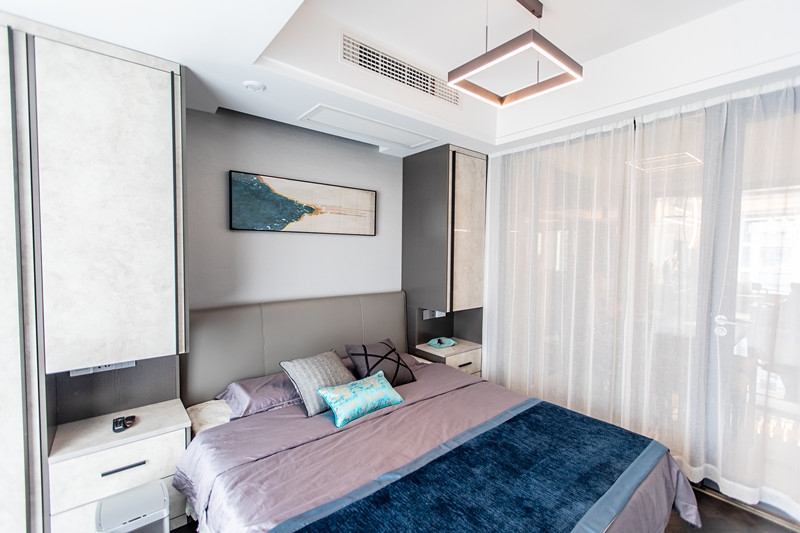 . s! a% V: }9 F$ ]. X% M d次卧在整个风格上更显得清新自然,不显得冰冷刚硬,给人一种温柔的被裹挟、包容的安全感;空间多处使用蓝色让人不自觉放松下来,空间遍布慵懒气息。