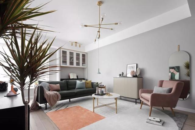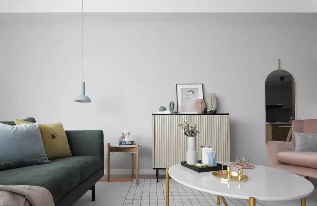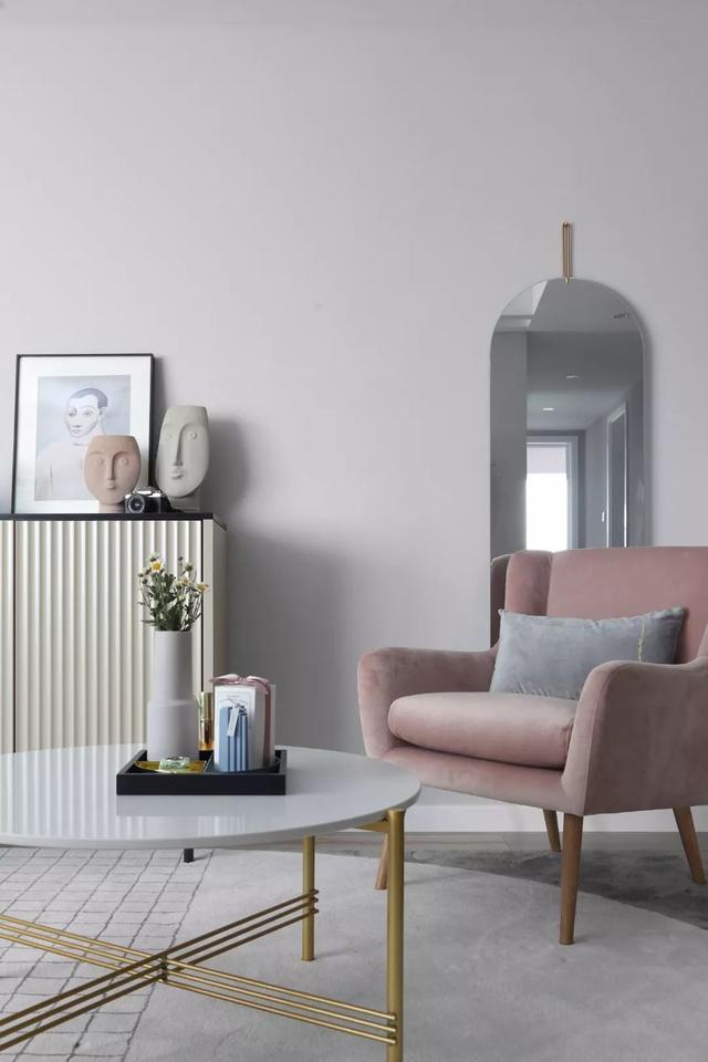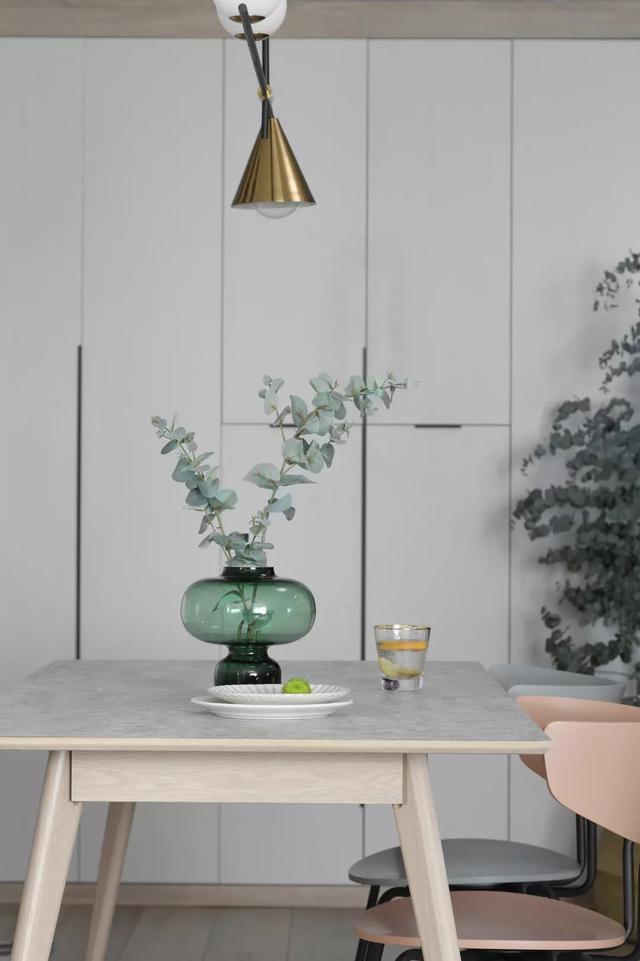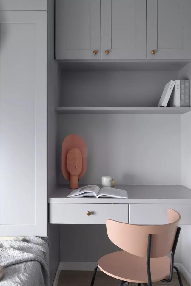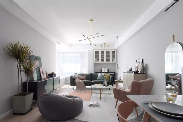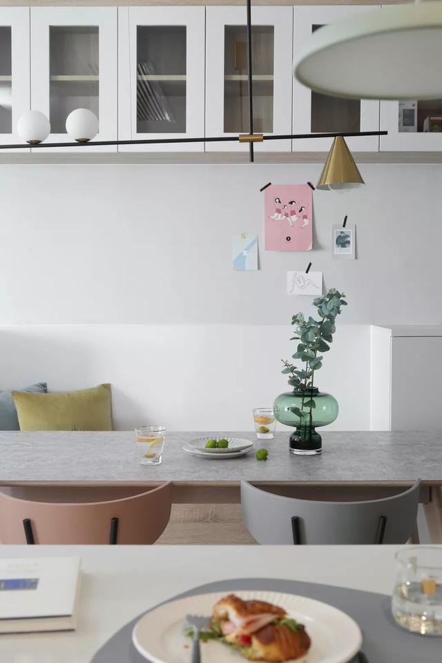 这套110平米的房子,在明亮舒适的采光下,在现代简约灰的硬装基础色调下,通过粉色等温情优雅的软装布置,点缀出一个充满自然与舒适质感的居住氛围感。 布置图 玄关 ▲玄关墙面刷成一面黑板墙,装饰上几个圆形小纽扣装饰,结合角落的一盆干树装饰,让回家的第一个画面显得充满文艺自然的气质感。 客厅 ▲客厅沙发后方留空出一定的位置,在飘窗旁边做了一个顶嘴的吊柜,下方的空位刚好摆上一台钢琴,使得客厅空间温情而又浪漫舒适。 ▲没有电视墙的概念,整体客厅以休闲聊天的功能为主,摆上简约优雅的家居布置,呈现出一个温情轻松的惬意气质。 ▲靠墙还有一个小斗柜,结合大理石质感的金属架茶几,摆上精致的软装细节,营造出一个华丽端庄的氛围感。 ▲黑+绿色的电视柜,柜面上的蓝色+粉色调的装饰画,结合旁边的一盆千年木,让空间显得充满清新的活力自然感。 餐厅 ▲餐厅以木色的卡座+吊柜,搭配上简约舒适的餐桌椅布置,呈现出一个娴雅轻松的用餐仪式感。 ▲餐桌上的花瓶与果盘、水杯,结合铜色的吊灯,呈现出一个轻奢自然的用餐氛围感。 ▲墙面的小贴纸,也在不经意间描绘出细腻轻松的气质。 厨房 ▲厨房地面铺设着雅白的六角砖,搭配白色长条墙砖,木色的橱柜,呈现出一个文艺轻松的烹饪空间感。 卧室 ▲卧室在粉色调的空间下,搭配灰蓝的软质布艺床,给人以浪漫闲适的轻松感。 ▲床头侧边的梳妆台,搭配圆镜与床头壁灯,也为主人提供了一个浪漫轻松的梳妆打扮小角落。 ▲另一侧的床头柜,摆上干花,垂下一盏白色吊灯,点缀出一个温情优雅的华丽感。 卫生间 ▲卫生间在灰色水磨石地砖基础,结合雅白的墙面砖,而洗手盆上方的镜柜延伸到马桶上方,并在吊柜上方暗藏了灯带,让空间显得温馨而又自然。 儿童房 ▲窗边摆了一套小休闲桌椅,打造成一个闲适雅致的小角落。 ▲墙面的这个仙人掌造型金属挂钩,也让空间显得格外的精致自然。 书房 ▲书房以定制榻榻米+书桌的组合,整体淡灰色的空间,搭配粉墨色座椅与摆饰,让空间显得文雅实用好舒适。 % _2 g0 g4 P, F" w" n l; L, P! {