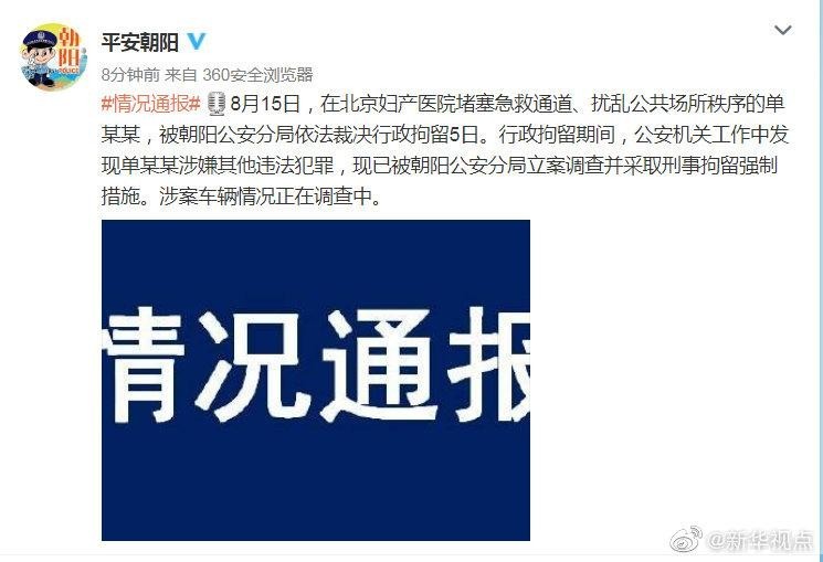 朝阳警方通报:不听劝阻堵塞医院急救通道的女司机被立案调查、刑事拘留 |