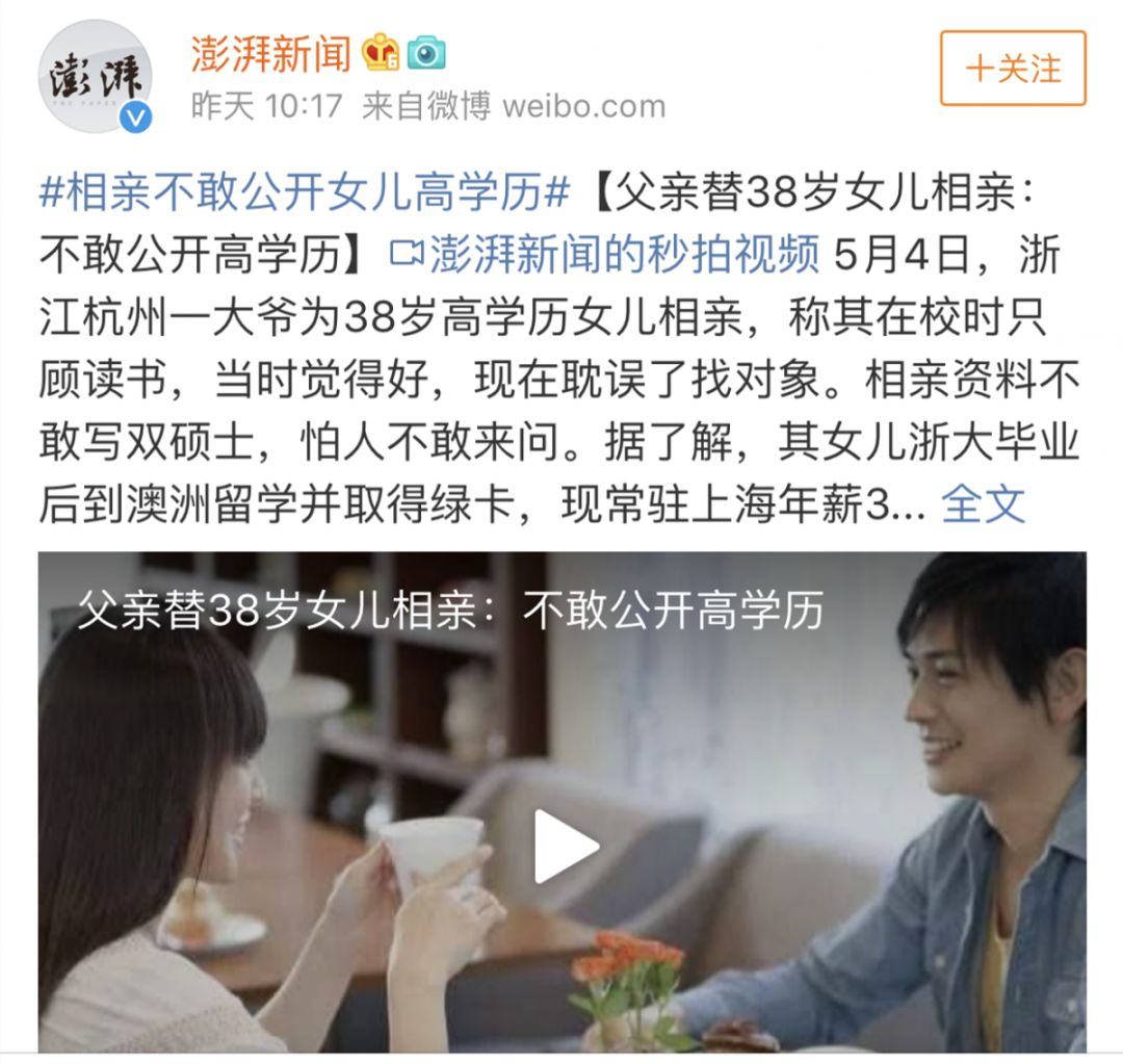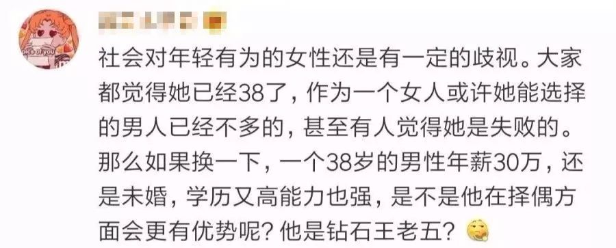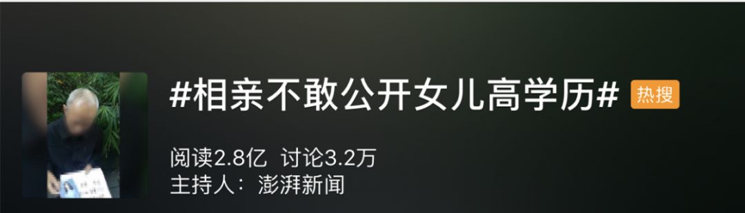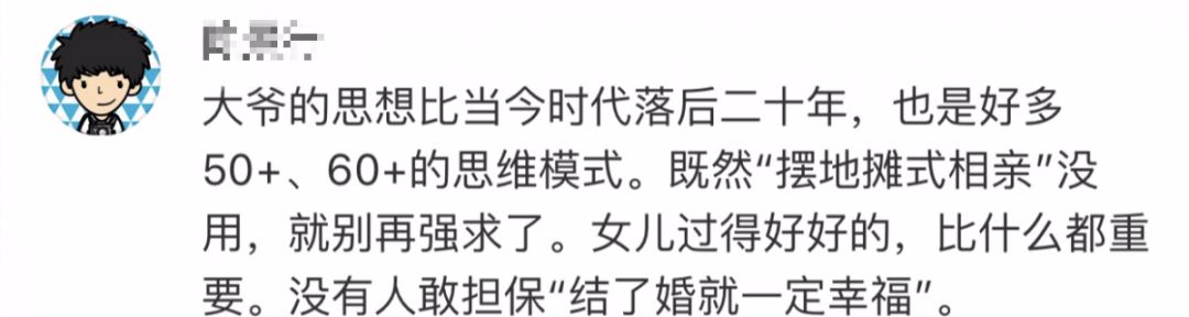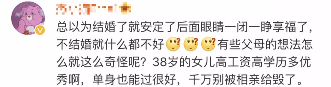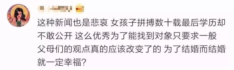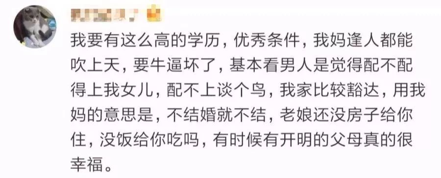 想终结脱单 靠自己也是不可能的了 大概只能靠相亲! 但是问题来了 现在相亲市场这么火爆 大多数年轻人之所以单身 是因为身边缺乏合适的人选 (合适的人选=有钱+有颜+… ) 所以,你知道我们为什么单身了吧 真的是凭实力(穷+丑)啊!! 相亲不敢公开女儿高学历 近日 一条新闻刷爆网络各大平台 #相亲不敢公开女儿高学历# 一位老大爷来到公园相亲角 为自己38岁的双硕士女儿相亲! 普通人考上研究生就很厉害了 她女儿竟然一口气拿了2个硕士学位?! 但是呢 老大爷却一上来就抱怨 说自己的女儿 “只知道读书”“不会找对象” 他说,女儿从浙大毕业后 到澳洲留学,还拿到了当地的绿卡 目前在上海常驻工作 注册会计师,年薪30万 老大爷坦言 女儿读书成绩好 一开始他感到很高兴 可是 “早几年就高兴不起来了” 女儿如今38岁了 却还没有成家 这成了他目前最大的心病! “条件好的,年龄相仿的早就成家了” “剩下来的可能都有原因的” 所以他也不要求对方条件有多好 差不多就行了 更让人吃惊的是 怕自己女儿自身条件太好 别人不敢上来问 老大爷还故意把女儿的条件写得差一点 女儿明明是双硕士学历 对外却说就读了个本科 为了逼婚 他试过很多招数 比如像电视里学习,给女儿下命令 再没找好对象,别回家过年了 但女儿也跟电视上一样见招拆招 说大不了 就租一个对象回家过年 网友:我有话要说 看完这个视频,网友炸了! 30万是美元吧… 这不等于是把LV往地摊上摆? 干嘛要委屈女儿找一个一般的呢~ 双硕士哪里丢人了… 这个条件单身也能过得很好 千万别被相亲给毁了 为了结婚而结婚 谁又能担保 结了婚就一定幸福呢~ 如果对方看到高学历条件好的女生 会畏惧和自卑 我觉得他也配不上您女儿的~ 只有让男女平等的思想真正深植于人心 才能慢慢改变人们的观念 也有人晒起了自己开明的父母 让许多网友大呼羡慕! 我们身边有很多这样的中国式父母 读书时候不允许孩子恋爱 一毕业就逼着孩子结婚 最好是一出社会就有孙子或外孙抱 可这也太难了吧? 虽说社会的包容度在增加 婚姻不再是唯一的选择 但作为父母 希望孩子将来能有个可以依靠的人 这份心情也是可以理解的 单身就有错吗? @BLUE star 你想要过什么样的生活取决于自己! 作为一位83年大龄剩女,我要忍受外界冠上“嫁不出去”的压力,同时坚持着不随便找个人出嫁的执念。 世界很大,找到真爱固然是幸运,没能找到也不要紧,但切记,不要活在他人的目光之下。也不要受到别人的影响而随便找一个。既然没有一个可以让我结婚的理由,那不如单身的自在! @忍者神鲸 已经无所谓结婚不结婚,爱咋咋的! 马上就三十一周岁了,工资不高不低,颜值嘛,凑合着看。几乎不相亲,没兴趣,不社交,不喜欢和人暧昧不清。 像我这样的大龄女青年,我爸绝望到去请算命先生算了很多次。26岁那年我爸告诉我,算命先生说我要是26岁还不结婚,想再结婚就要等到36岁了。 我当时回答了我爸一句,我要是36岁能结婚,那26岁还着什么急... 其实吧 这么优秀学历又高的女性 人家一个人也能过得很好 可能压根就没着急结婚 缘分这个东西 是不会因为你学历高或是学历低就不来了 说不定哪天 姑娘突然就遇到了她的真命天子