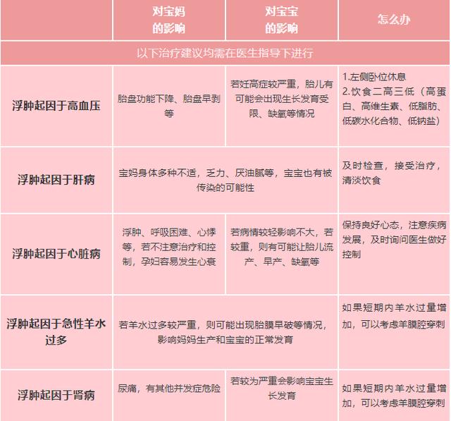 许多宝妈都会发现,到了孕中晚期,不仅肚子变大,连腿脚,也跟着一起“长长长”,仿佛身体在努力让“体重”与“外表”同步增加...... 而这,很可能是因为一个可怕的字——肿! 孕期,一定比你人生中的任何时候,都容易肿! 浮肿看似温柔平和,其实有两幅面孔: 1.生理性浮肿 生理性浮肿的特点: 多发生在下肢,而且下午及夜晚的浮肿要比早上的浮肿严重,多在孕后期出现。 生理性浮肿的原因: 出现生理性浮肿,一是因为在怀孕期间,子宫变得越来越大。 达到一定程度,就会压迫下腔静脉,影响血液回流。 影响了血液的正常循环,自然会导致下肢的浮肿~ 二是因为在孕期,雌激素等体内激素增多,会影响体液交换失衡,导致浮肿... 生理性浮肿的影响: 生理性浮肿一般休息后可自行缓解,对肚子里的宝宝几乎没有什么影响,只是会给宝妈的生活带来一些小烦恼,比如刚买的鞋子穿不进去、裤腿变得紧窄等... 2.病理性浮肿 病理性浮肿的特点: 身体其他部位浮肿也较严重,休息后无法自行缓解,身体伴有其他症状。 但病理性浮肿也分不同的情况: A、妊娠高血压综合征 妊娠高血压→身心血管系统、肾系统受损→身体中水和钠排出减少→导致身体的浮肿 宝妈若有头痛、恶心、血压升高明显、休息后不能缓解的情况要及时去医院,筛查是否有妊娠高血压。 B、急性羊水过多 羊水快速增多→宫腔压力山大→胀大的子宫压迫下肢静脉→影响血液回流→最终导致浮肿 短期内宝妈的肚子快速增大,增长到怀胎十月的大小,同时会有呼吸困难、肚子疼痛的情况,急性羊水过多带给宝妈和宝宝的影响都是巨大的,做好每一次产检才能早发现早应对! C、心力衰竭 心脏功能障碍→静脉系统压力山大→体液滞留→由下肢先出现浮肿,后发展至全身浮肿 若宝妈在水肿的同时有呼吸困难、心慌心悸的情况出现,则要注意是否有心脏病的可能。 有一种和怀孕关系密切的心脏病——围生期心脏病,在孕期时像恶魔一样潜伏,切记及时检查。 病理性浮肿的主要症状: 病理性浮肿的影响: 注意:“病理性浮肿”对宝妈的影响是因“疾病”而起,浮肿带来的影响只占一小部分。 那怎么判断自己是生理性浮肿还是病理性浮肿呢? 方法很简单,这样来! 病理性浮肿要及时询问医生,那生理性浮肿该怎么办呢?总不能看着自己像成龙的头发一样duang duang 肿下去吧! 其实生理性浮肿的解决方法,都是功夫在日常: 1.不要久站、久坐,经常起来活动,哪怕你坐着抖抖腿都行。 2.穿舒适的鞋袜,鞋子最好准备一双大一号的,水肿时就不会夹脚。 3.多吃蔬果和富含蛋白质的食物比如肉、奶、蛋、大豆等,营养均衡摄入。 4.睡觉时把小腿垫高,有助于舒缓水肿。 5.睡前用40℃左右的水泡脚15——20分钟,可以有效缓解水肿。 6.宝爸人工按摩,按摩大法如下,不用谢我! √洗完脚擦干后,用手掌将宝妈的左右脚分别搓热。 √捏住脚趾,从趾根到趾尖,轻轻向外捋,十个脚趾都做一遍。 √让宝妈平躺在床上,宝爸一只手握着膝盖,另一只手握住宝妈脚踝,轻抚着让膝盖以下的小腿在空中划小圆,顺时针逆时针交替。 但是,在孕期并不是只要小腿变粗,脚踝变壮就是‘肿’,其实,也有可能是——胖! 很多宝妈就把自己的胖,误以为成了肿! 孕期的胖和肿,到底怎么区分? 点一点自己的小腿肉,胖的触感是这样的—— 按下去后能快速回弹,且皮肤表面无凹陷,就是胖! 肿的触感是这样的—— 戳一下缓慢才能回弹,且皮肤上有小凹陷,这就是肿! 宝妈们在孕期的烦恼事有很多: 平时爱美的自己现在素面朝天 平时喷香水的自己现在不敢闻多香水 平时高跟鞋紧身裤的自己现在三枪大短裤 平时努力维持身材的自己现在一水肿回到解放前 但是我想说,即使你不施粉黛,不再打扮,略显臃肿,你依然很美。 那个为孩子每天都在努力,时刻保持积极的你,浑身都散发着,最伟大的光芒。