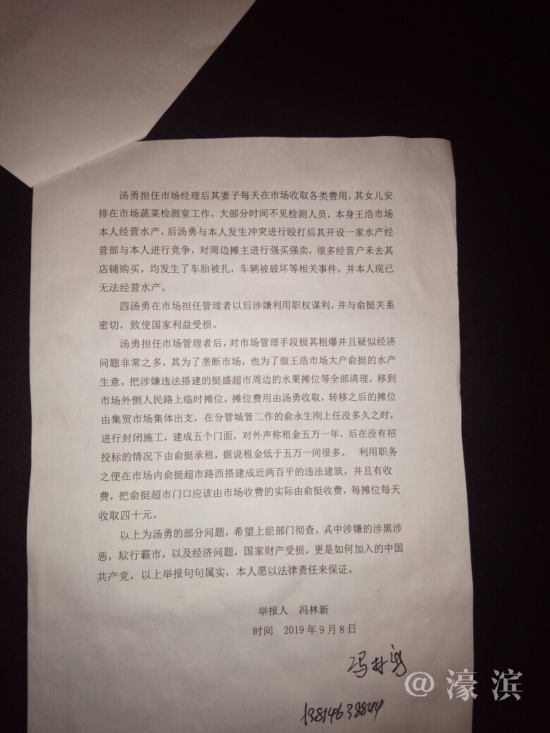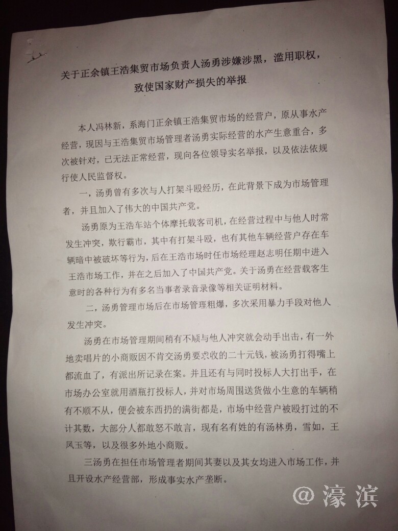 [焦点爆料] 实名举报海门正余镇王浩市场管理者汤某涉嫌相关问题 |