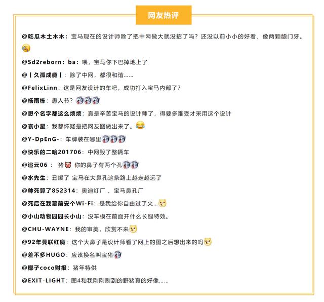2019法兰克福车展上,宝马汽车亮相了全新4系两门轿跑概念车,超大的双肾进气格栅让广大网友看了直呼受不了,甚至连阅车有点多的漫哥一时都接受不到,不知道我的审美能不能抢救一下,当我看到这个概念车的时候,差点吐了……但是这是宝马呀,必须是我审美跟不上了,如果买双AJ磨脚那肯定是我脚长得不够标准。 下面先给大家分享下广大网友是如何吐槽全新宝马4系(参数|图片)概念车的…… 说实话,一向保守传统的宝马这次真的令漫哥我感动好陌生。除了这个被网友喷出翔的巨大双肾中网外,这台概念车(参数|图片)也抛弃了宝马品牌之前的一些传承。首先,完全消失的"霍氏弯角",这个令人感到陌生的C柱看着有点不习惯。其实在G20/G28这代3系(参数|图片)车型上,霍氏弯角已经开始"变异",但此次竟然完全消失了,对于这个C柱,你们还喜欢不? 其次,宝马不间断贯穿腰线是它们一个传统,而此次也变成了断开三段式的腰线。 当然,新车除了前脸备受吐槽外,其尾部造型和尾灯还是挺吸睛的,经典鸭尾向下延伸的曲面,配上尾灯的反光效果,这个设计可以说很走心。 而在侧面,直接上了一套21寸"立体"的轮毂,看起来跟点机械手表的味道。至于内饰,尚未曝光,所以漫哥也比较期待,一向被人吐槽的宝马内饰,是不是也跟前脸一样,有了个翻天覆地的变化? 一个有着传承、也被传承束缚的BMW,做出如此"肆无忌惮"地的改变,讲真,风险和突破并存,做不好玩完一代车型,做好了突破自我,上升多一个境界。但漫哥想说:"如今宝马全新4系概念车长这样,以后宝马车型的鼻孔要是都这么大,你还爱吗?" 【这鼻子,真的有人令人受不了】 【看看老款,多协调、多漂亮】