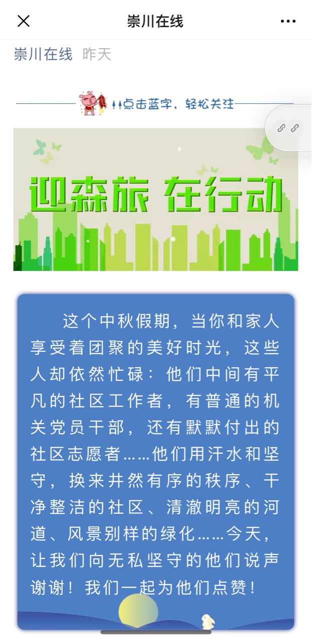 9月13日是中秋节,虹桥街道跃龙社区工作人员与共建单位、街道挂钩部门、小区物业、居民志愿者,共同将小区内的建筑垃圾清运出小区,此次清理行动,共清运建筑、生活垃圾近10卡车。每天早上不到7点就赶到社区,城东街道板桥社区卫生主任陈扬,家住在城西,每天上班乘公交36路大约30分钟车程,为了迎接森旅节,最近,他基本都是早上7点不到就赶到居委会,梳理当日需要清理的点位,联系工人,交代任务,约定好地点。7:30左右,出门对辖区内的金通河(板桥段)和板桥东河两处重要水体进行检查,确保水体周边没有垃圾和堆放。中秋节期间,他坚守岗位,配合环卫,动用大型机械,对辖区内疑难堆放进行集中整治,清理建筑垃圾以及杂物30多吨。