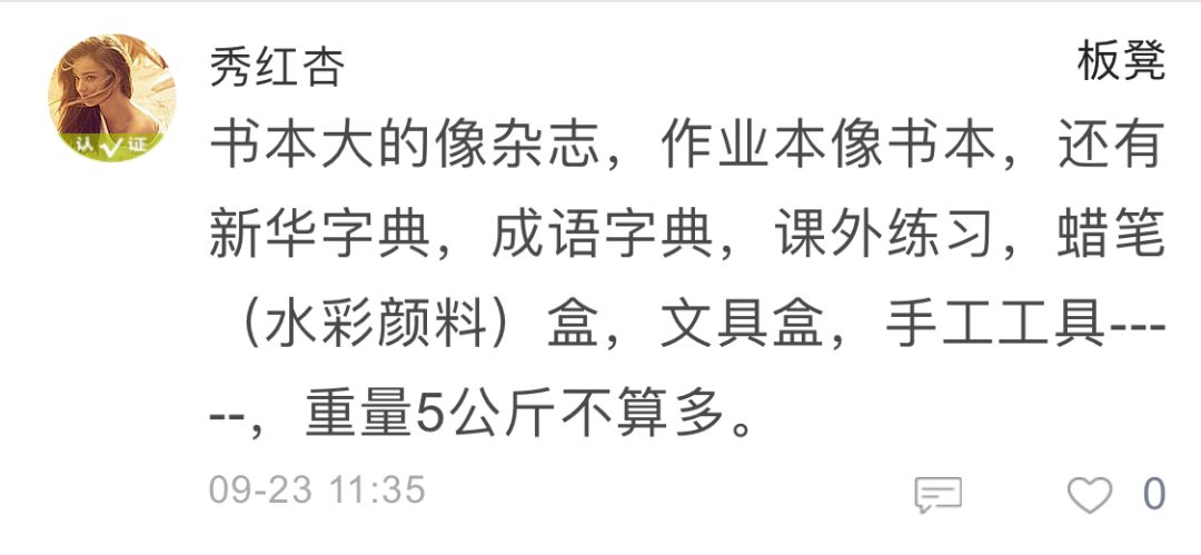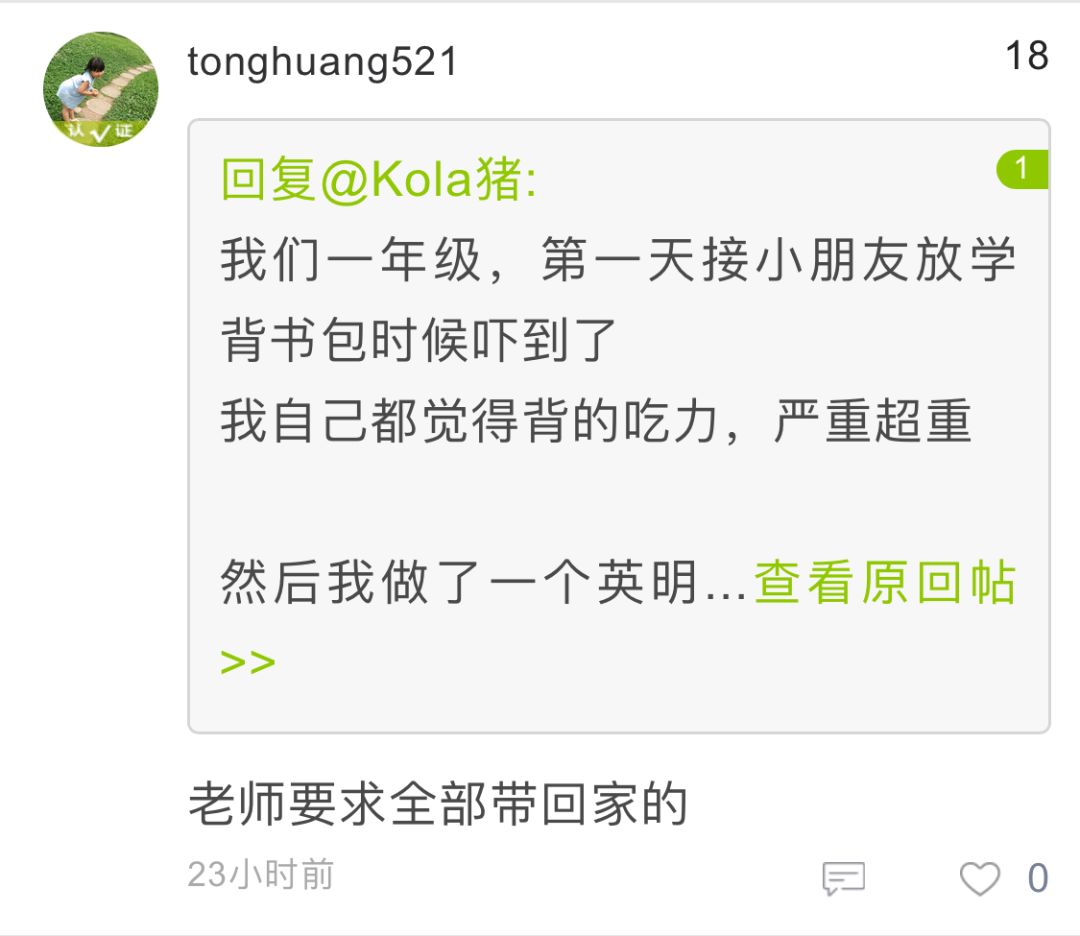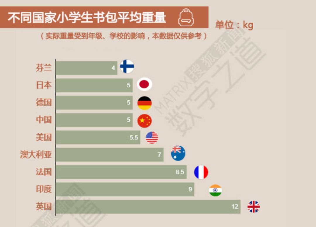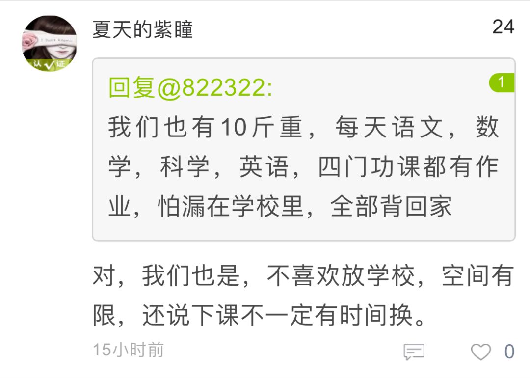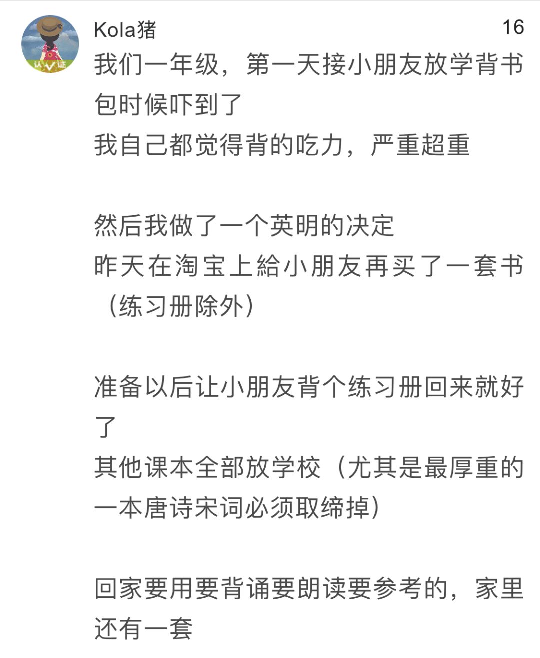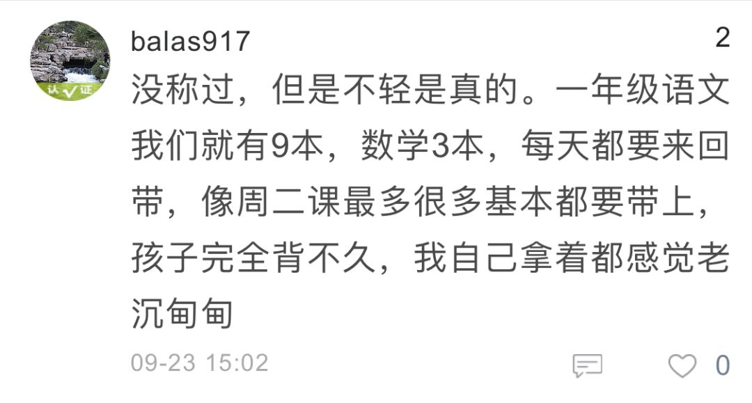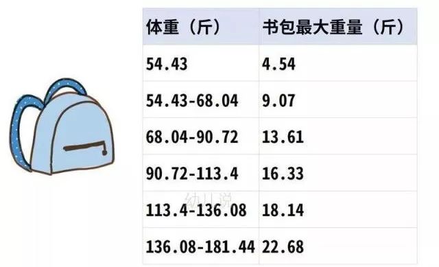 书包是每个孩子上学的必备品 可就是这么一件日常又普通的东西 也让一些家长犯了愁…… ▽ 19楼网友@夏天的紫瞳 早上把娃的书包放体重秤上一称,赫然显示5公斤!猛然想起前几天看到的儿童书包不宜超过体重10%的说法,按孩子五十斤的体重,那书包的重量上限就是五斤,现在足足超了一倍! 孩子每天自己上学,我发现有时候他背书包时身体重心不稳,导致走路会往前倾,真担心长此以往会影响孩子的发育。这也难怪现在上学路上帮孩子背书包的家长那么多,也是无奈之举啊! 不知道有同样顾虑的妈妈吗? 这位妈妈的担忧也引来很多网友热议。 在众多网友的留言中 出现最多的言论还是和楼主一样 感叹娃的书包实在是太重啦! 于是,为了了解更多孩子的情况 在论坛上做了一个小调查 调查面向各位家长: 你们家小朋友的书包有多重呢? 而对于这么多家长同时心疼自家娃的书包太重 一些热心网友也纷纷献计 表示可以备一些书在家或者直接改用拉杆书包 然而,这些建议却似乎不适用于每个孩子 有家长称拉杆书包不是每个学校都允许用的 还有家长表示有的老师会要求孩子把所有的书都带回家…… 其实,孩子的书包太重也算是一个老话题了。 据一项调查显示 我国小学生的书包平均重量已达到5kg 而这种情况还不止发生在我们国家…… 这些数据也震惊了不少网友。 很多人表示,虽说孩子去学校难免要背一些学习用品和生活用品,但对于还在发育的小学生来说,要负担如此重量的书包完全是不科学的。 书包背得过重确实会给孩子的健康带来一些伤害。据专家介绍,孩子背的书包过重则脊柱会持续受到过大的压力,导致肌肉骨骼疼痛和结构性脊柱变化,从而影响孩子的站姿和步态,最明显的表现就是驼背。另外,书包过重还会使孩子长期习惯身体往前倾和垂头,导致孩子的肺活量减少,增加了精神不振、注意力不集中和记忆力下降的概率。 那么,书包多重才是不损害孩子们健康的书包重量呢? 一般的标准数据是:小朋友12岁前,书包的重量最好不要超过体重的10%;孩子12岁之后,最好不要超过体重的15%。 下图是美国整脊协会( American Chiropractic Association)建议的健康范围内的孩子体重与书包重量对照表,各位家长可以参考一下,看看你家孩子的书包是否超重了: 你家孩子背的书包有多重? 在孩子的书包太重这个问题上, 你有什么看法?