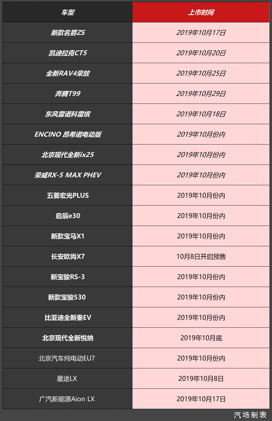 10月除了有我们期待已久的7天长假以外,还有19款车型将于本月上市,其中关注度比较高的有全新RAV4荣放(参数|图片)、奔腾T99(参数|图片)、荣威RX-5MAX PHEV、新宝骏RS-3、星途LX等车型。 新宝骏RS-3 上市时间:10月内 据了解,新宝骏RS-3将于10月正式上市,新车定位一款小型SUV,将搭载1.5L或1.2T发动机。 设计上,宝骏RS-3基本延续了宝骏RS-5(参数|图片)的设计理念,大尺寸前格栅与分体式大灯组像结合,视觉上看不仅厚重感得到提升,而且运动感得到进一步提升。 双色车身的设计是新车的一大亮点,视觉上年轻动感。 车身尺寸方面,新车长宽高分别为4300/1750/1625mm,轴距为2550mm。与宝骏510相比,新车长度增加了100mm,宽度增加了10mm,轴距保持一样。 与同级别竞品车型长安CS35 PLUS(参数|图片)、吉利缤越(参数|图片)相比,新车在车身尺寸方面并不占太大的优势。 配置方面,新车将提供天窗、A柱黑膜、双色车身、多种格栅样式、鲨鱼鳍天线、前中门窗黑膜等。 此外,据了解,新车还将搭载宝骏24小时在线车联网,以提供更好的互联驾驶体验。 动力方面,新车将提供型号为L2B的1.5L自然吸气发动机和245T的1.2T发动机,其最大功率分别为77kW(105PS)和96kW(131PS)。 全新RAV4荣放 上市时间:2019年10月25日 全新一代RAV4荣放于2019上海车展正式亮相,新车基于丰田TNGA-C平台打造而来,与奕泽、CH-R等车型采用相同的平台。 据了解,新车将于10月正式上市,并将推出搭载2.0L燃油版和2.5L双擎版(混动)两种动力车型。此外,混动版车型申报油耗为4.6L/100km。 全新一代RAV4荣放前脸采用上中下三部分组成,上面是一条矩形封闭式格栅,并与大灯相连,中间是进气格栅,下面是前唇,并采用亚光黑与银色搭配,整体比较硬派。 车身尺寸方面,全新一代RAV4荣放长宽高分别为4600/1855/1680mm,轴距为2690mm。与现款相比,新车宽度增加10mm,高度降低10mm,轴距增加30mm。 新车中控台采用了对称式设计,三辅式方向盘、悬浮式中控屏以及真皮和缝线的加持,彻底打破了以往配置低、内饰一般的标签。 配备上,全新一代RAV4荣放配备一键启动、无钥匙进入、多功能方向盘、7英寸悬浮式中控屏、自动空调、自动刹车,陡坡缓降、天窗、5个USB接口、11个扬声器JBL品牌音响以及无线充电等。 值得一提的是,新车还配备了第二代Toyota Safety Sense丰田智行安全系统、车道偏离预警、车道辅助保持、自动远光,以及新增的车道跟踪辅助系统、路标识别。 动力方面,新车搭载2.0L自然吸气发动机和2.5L混合动力系统,最大功率分别为171马力和178马力。同时,两款动力系统都满足国六排放标准。 奔腾T99 上市时间:2019年10月29日 一汽奔腾全新旗舰SUV-奔腾T99于今年9月19日在长春工厂正式下线,新车采用家族最新的设计理念,整体年轻时尚又大气。 同时,新车正式公布预售价格,其预售价区间15.99-19.99万元。据了解,新车将于10月29日正式上市。 设计上,奔腾T99沿用了与奔腾T77一样的T家族的“光影折学”设计语言,八边形大尺寸进气格栅比奔腾T77的更大,内部采用点阵式设计,显得更为宽大,整个前脸的冲击力更强。 车尾贯穿式的尾灯组造型犀利,内部则辅以LED光源,点亮后视觉效果不错。 车身尺寸方面,奔腾T99长宽高分别为:4800mm/1915mm/1685mm,轴距为2870mm。 与同级别竞品比亚迪唐 、传祺GS8、哈弗H7等车型相比,新车2870mm的轴距可谓是同级别中最长,其乘坐空间也不容小视。 内饰整体以黑色为主,大面积真皮包裹+贯穿式空调出风口设计+镀铬装饰条的点缀提升了新车内饰的品质感。 双12英寸大屏+空调触控屏提升了奔腾T99 内饰的科技感,同时新车还配备了丰富的“黑科技”,包括升级版的D-Life系统、智能驾驶、3D全息投影、人脸识别等。 值得一提的是,3D全息投影这个功能,该系统能够提供3种人物形象,5种个性装扮,以及3种才艺技能。 据了解,新车将搭载一台2.0T发动机,该发动机最大功率高达165kW,最大马力224Ps,最大扭矩340N·m。 该发动机现已经在红旗HS5上应用,其中最高车速210km/h,并满足国六排放标准。 凯迪拉克CT5 上市时间:2019年10月20日 早在今年7月底,上汽通用汽车凯迪拉克品牌就宣布将于第四季度推出全新后驱豪华轿车——凯迪拉克CT5。 新车在2019成都车展正式亮相,据了解,新车将于10月20日正式上市。 设计上,国产凯迪拉克CT5采用了凯迪拉克家族式设计理念,扁平的盾形前格栅内部由阵列排布的诸多小尺寸盾形装饰块组成,形成点阵式格栅的效果,视觉上看起来精致不少。 车尾最吸引眼球的就是裸露的双边共两出式镀铬排气和内嵌竖型的LED尾灯,视觉上富有很强的运动感。 国产凯迪拉克CT5的长宽高分别为4924/1883/1453(1445)mm,轴距为2947mm。 与全新一代宝马3系长轴版车型相比,国产凯迪拉克CT5长度和宽度占据一定优势,分别比3系长轴版多95mm和56mm,轴距却相差3系14mm。 动力方面,国产凯迪拉克CT5将搭载2.0T直列四缸发动机,最大功率241马力,满足国六排放标准,传动系统预计将匹配10AT变速箱。 星途LX 上市时间:10月8日 星途LX是星途汽车旗下第二款SUV,新车定位低于星途-TX,是一款紧凑型SUV,其主要竞争对手就是哈弗H6、博越、传祺GS4等主流车型。 新车于2019成都车展期间开启预售。据了解,新车将于10月8日正式上市。 新车在设计上基本保留了星途-LX概念车的设计理念,贯穿式格栅、柳叶式LED大灯、贯穿式尾灯、悬浮式外后视镜等设计都都得保留。 车身尺寸方面,星途-LX长宽高分