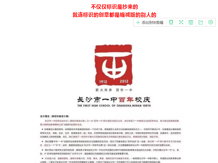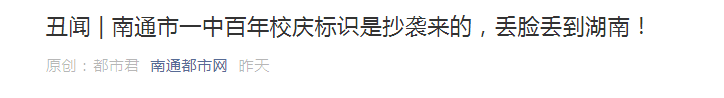 近日,《南通都市网》公共号发布了一篇有意思的文章,大意是说南通市一中百年校庆标识是抄袭来的,理由是南通一中百年校庆的标识和长沙市一中1912——2012百年校庆标识长得一模一样。据此,都市网公共号觉得这是一个丑闻,其实仔细想一想,这也算不上丑闻,只不过长沙市一中“提前”几年盗用了南通一中的创意,所谓“不谋而合”在这里得到淋漓尽致的展现。 长沙市一中是长沙市四大名校之一,也是中国著名的重点中学,在2012年百年校庆之时,集思广益设计出简洁明了的校庆LOGO,几年后,远在千里之外的南通一中也在校庆之时思想碰撞出高度雷同的火花,这灵感和创意令人拍案叫绝,老实说,哲木观察无法理解长沙市一中在这么重要的校庆活动上会出这么幼稚的问题?你可是响当当的地方名校啊!还有教育之乡的美誉加持,为何提前搞出和南通一中如此雷同的校庆LOGO?教书育人之学府,长沙市一中竟无前瞻创意,几年后竟被雷同,你让我们南通教育之乡的人民咋看你,提前抄袭有意思吗?真让人无地自容!