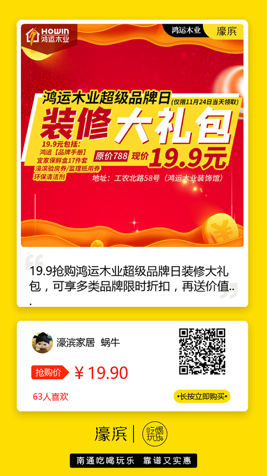 19.9元抢购鸿运木业超级品牌日装修大礼包 鸿运【品牌手册】+宜家保鲜盒17件套+濠滨验房券+监理抵用券+环保清洁剂 小编提醒:装修大礼包仅限11月24日当天现场领取(过期可退) 还在犹豫什么!冲鸭!