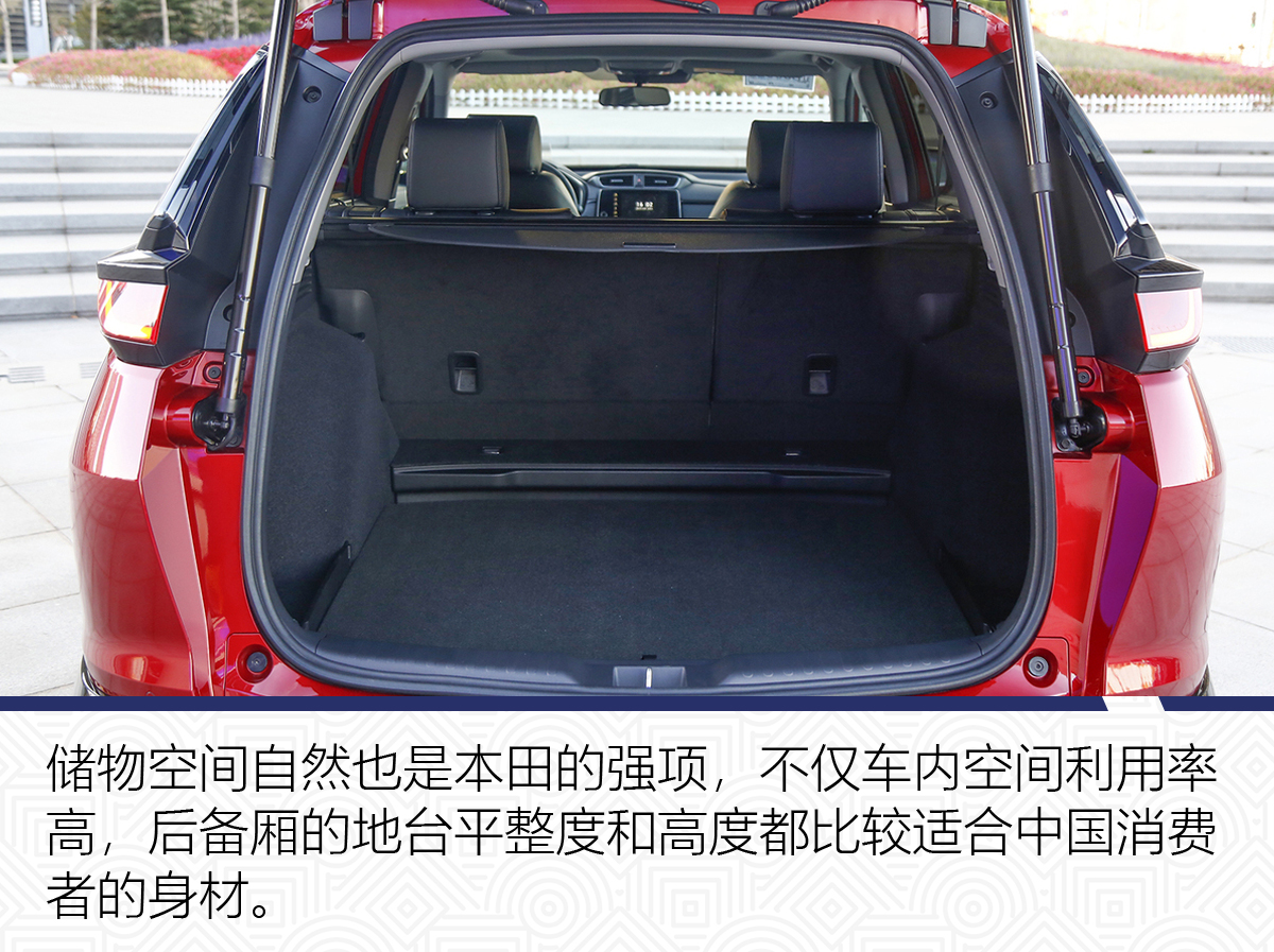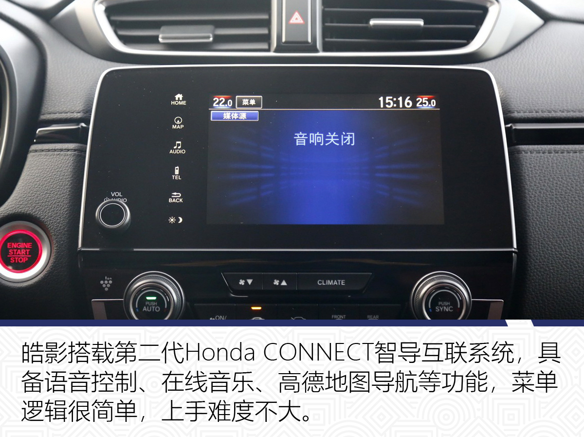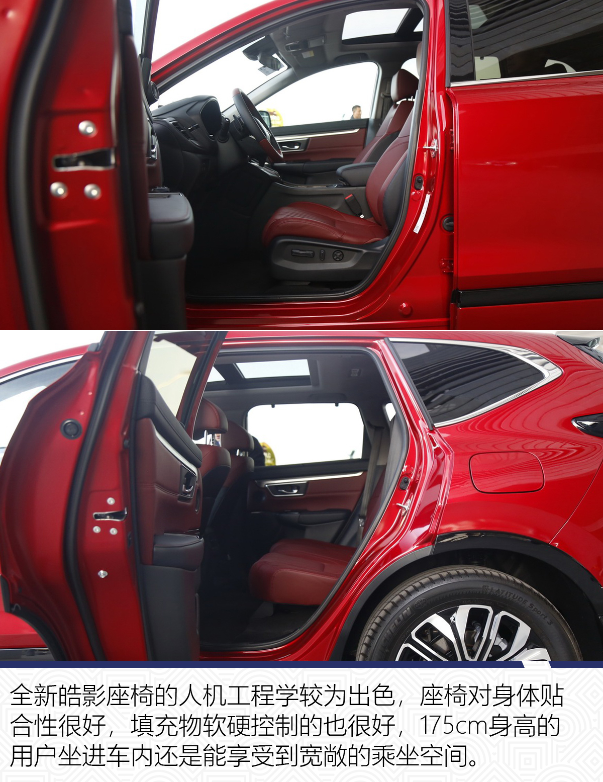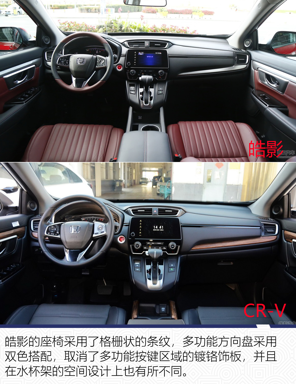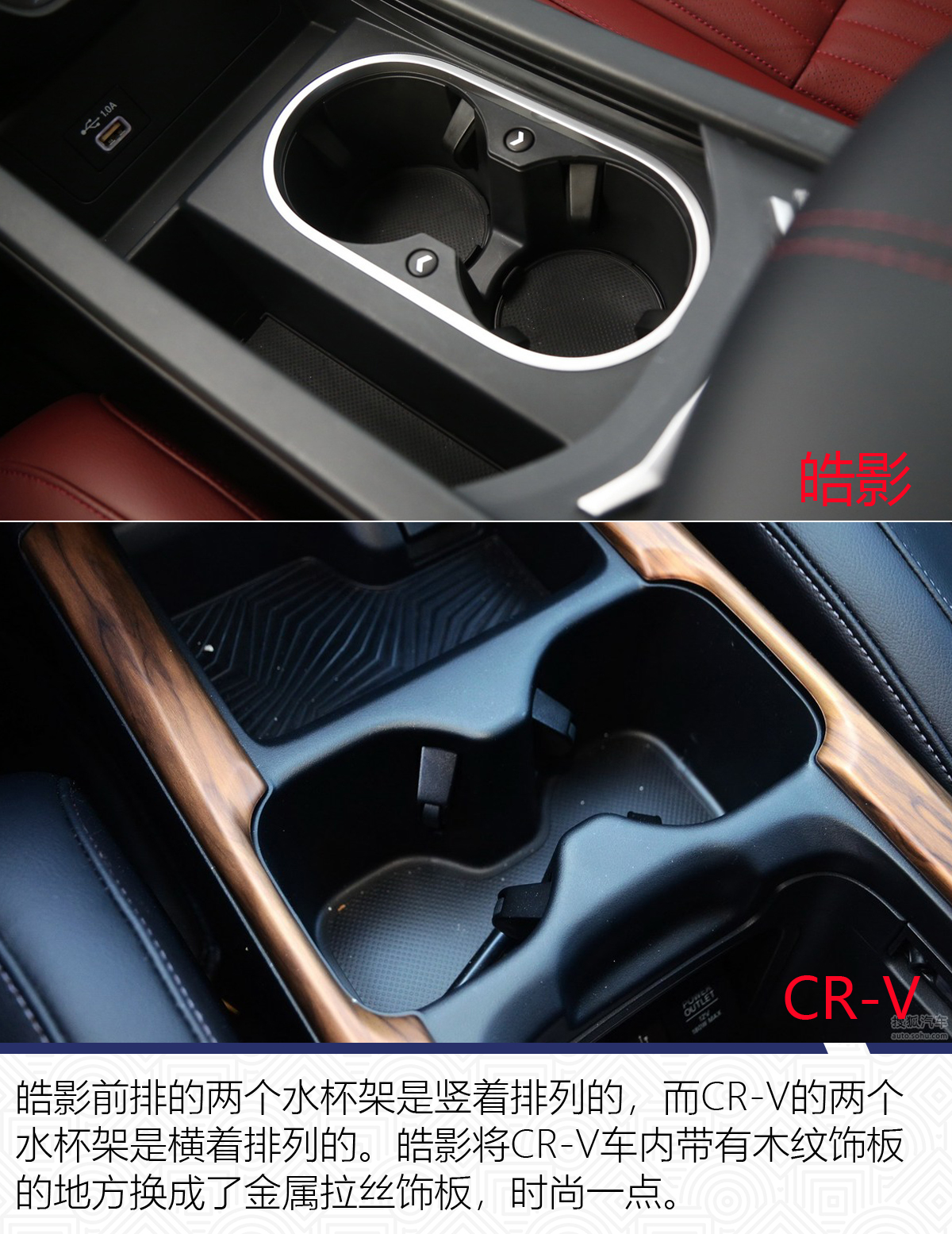 内饰设计部分的同质化就比较严重了,如果我不指出区别,你很难分辨那一台是皓影、那一台是CR-V。皓影的座椅采用了格栅状的条纹,多功能方向盘采用双色搭配,与座椅配色高度呼应,取消了多功能按键区域的镀铬饰板,并且在水杯架的空间设计上也有所不同。
