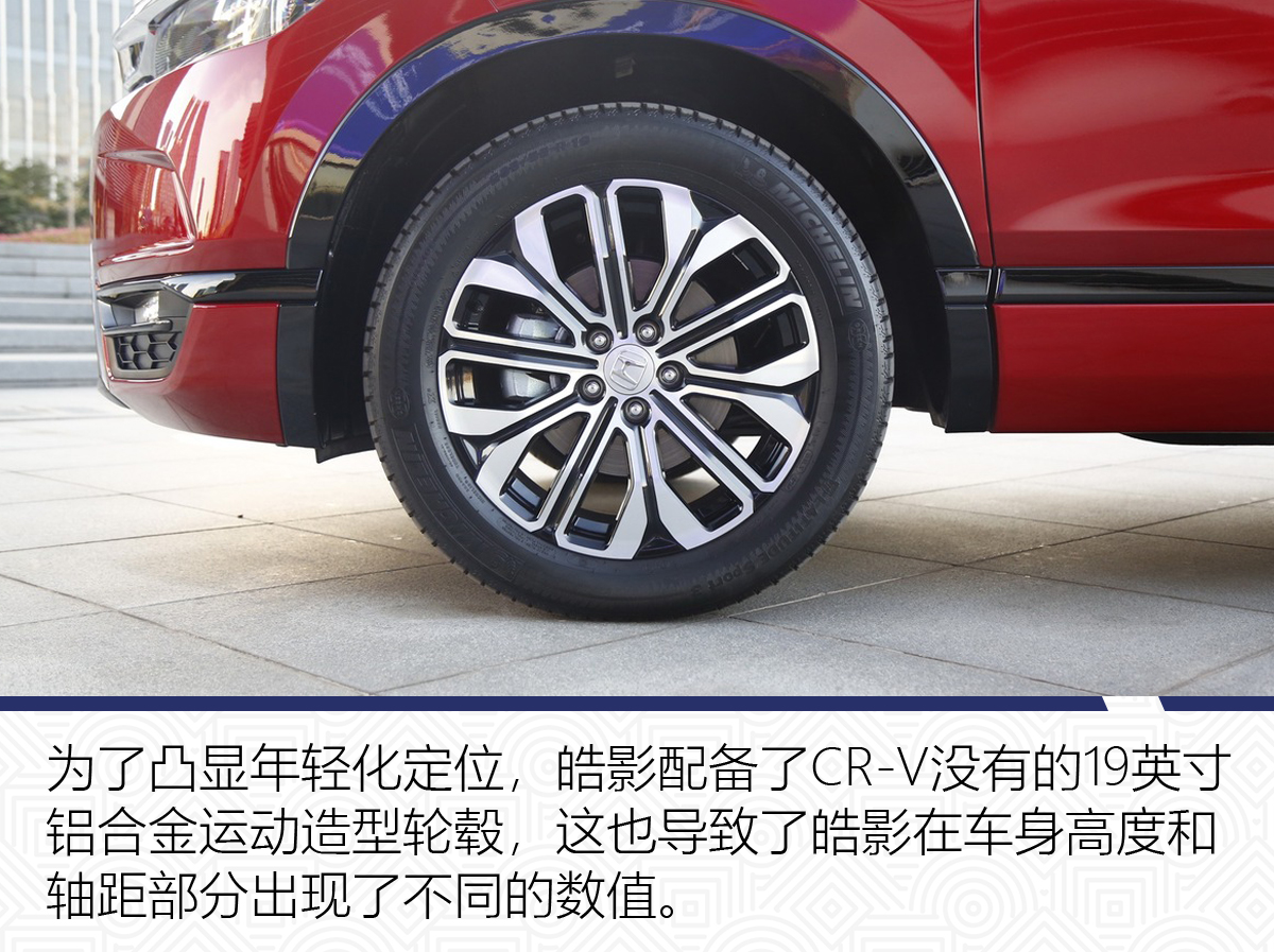 皓影的侧面车身很有辨识度,车辆底部的包围采用与车身同色设计,且底部黑色线条贯穿车身直至车尾,很容易就能和东风本田的CR-V区分开。虽然皓影是CR-V的姊妹车型,但是在车身尺寸上还是保留了特殊性,皓影的车身长度明显大于CR-V,其余尺寸差异不大。