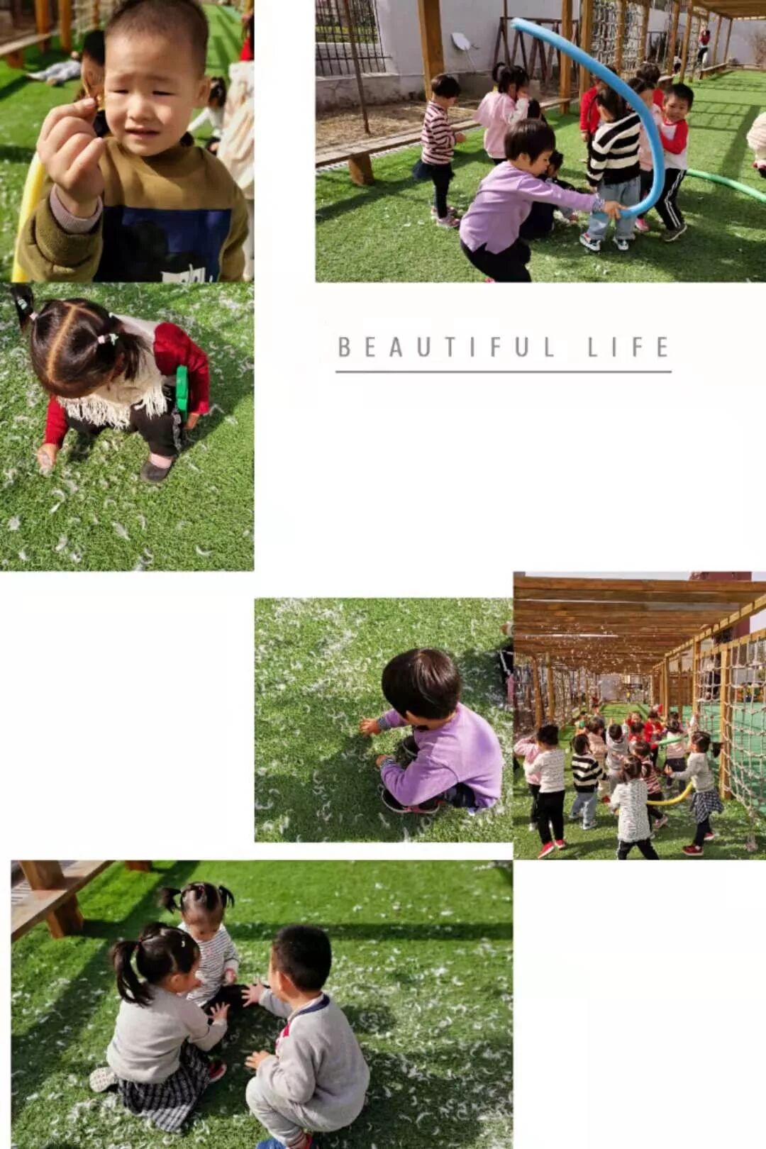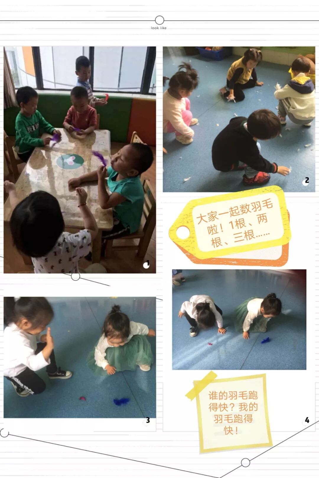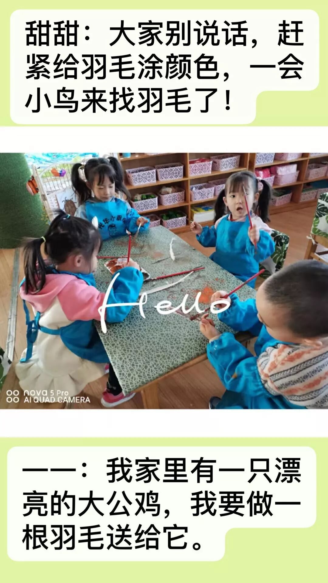 周末到啦,今天要和爸爸妈妈一起去动物园咯! 但是这次不光光是玩儿哦,我们还要完成自己的调查表呢!带上印章和表格,去找一找、看一看吧!我找到表格上的动物还会盖章涂色呢!如果动物有羽毛还要盖章并涂上相应的颜色。 桐溪:妈妈,我找到了孔雀!快给我拍下来! 朱嘉乐:嘘!我正在喂鹦鹉吃东西,它的羽毛好小。 翁少宇:孔雀孔雀,你喜欢吃棒棒糖吗? 徐博涵:这只鸡的羽毛是花的!我都没看见过! 朱雨辰:我找到了表格里的孔雀。姐姐,你帮我拿着表格,我来盖章! 星期一到了幼儿园,老师把孩子们的调查表张贴到了主题墙上。餐后散步时,孩子们纷纷围过来,指着自己的调查表,兴奋地跟小伙伴们介绍自己的发现。 4. 乐一乐 户外活动《飞舞吧,羽毛》中,孩子们带上羽毛,到绿草地上玩一玩、比一比,他们完全陶醉在羽毛的世界里,欢呼着、跳跃着。在感受羽毛的过程中,有的用手接,有的在地上打滚,有的把羽毛堆成一堆,有的把羽毛戴在头上,有的亲吻着羽毛…… 美的材料和情境吸引着孩子,陶治着孩子的性情。 5.做一做 毛茸茸的小鸡离幼儿的生活经验比较近,拼拼、贴贴、画画又是幼儿喜欢的活动,因此羽毛拼贴画就是根据幼儿的兴趣、内在需求开展的。活动中,孩子根据自己的兴趣和需要,大胆选择、使用各种各样的羽毛进行操作中,教师细心观察、倾听孩子的语言,为后续的活动做了有效的铺垫。 再识羽毛 1.绘本故事:《谁的羽毛丢了》 小班幼儿爱模仿。在角色游戏过程中,他们模仿成人或同伴的行为,同时其行为和动作也反映自己对周围现实生活的认知和感受。通过游戏,幼儿懂得要做一个助人为乐的孩子,捡到东西要归还给别人。在此过程中,他们的语言、动作、社会交往能力等方面都得到了较好的发展。 2.各种各样的羽毛 南通0 |