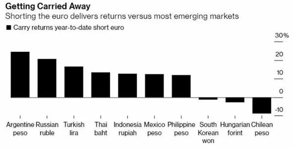 长期以来,日本一直实行负利率政策,日元因此成为套利交易融资的首选货币。 现在,欧元也走上了相同的道路。 德意志银行全球货币研究主管George Saravelos在本周表示,“没人真正想将欧元作为资产持有,但大家都想借入欧元作为负债。这样做的结果就是,欧元区会逐渐成为全球金融系统的新一代流动性提供者。” 套利交易策略 投资者利用不同国家短期利率差异,将资金从低利率国家转移至高利率国家,从中获取利息差额收益。 例如,一家美国公司可以用廉价的欧元发行债券,然后将收益转换为美元;一家新兴市场的大型企业可以从某个欧洲银行借入欧元,然后将所得款项投向其他资产。 一般情况下,当汇率波动性较低时,这种交易策略的运作效果会比较好。今年开年以来,欧元已下跌超过3%,但由于欧央行和美联储都推出了相似的稳健货币政策,欧元对美元汇率的波动率在11月末创下历史新低。 自2016年3月以来,欧元区主要再融资利率一直维持在0.0%的历史最低水平,今年9月,欧央行首次将存款利率降低至-0.5%的水平。从这一点上看,欧元也符合了融资货币低利率的特征。 数据来源:Trading Economics 一般来说,一国的通胀率会与货币价值成负相关关系,因为通胀本身就代表货币的内在价值下降。但由于“套利交易”的存在,通胀率往往会与币值成正相关关系。原因在于,套利交易往往购买的是名义利率较高的货币,而这些货币往往也有较高的通胀率。所以,这实际上会导致高通胀货币相对于低通胀货币的升值与以往的长期关系相悖。 也就是说,这种投机活动越多,通胀与币值的正向关系就越强。而这种现象对于新兴市场这种通胀相对较高的货币有利,但对欧元这种融资货币来说是有害的。 在彭博社追踪的23种新兴市场货币中,以欧元作为融资货币进行套利交易,有20种货币是获利的,而以美元融资获利的只有10种。也就是说,作为套利交易的融资货币,欧元的表现要远好于美元。 图片来源:彭博社 事实上,自2017年以来,欧洲已经成为世界其他国家的主要贷款国。目前,欧元区银行对非居民的贷款水平是2008年以来的最高水平,非欧盟银行的欧元计价债务也在大幅增加。据德意志银行估计,过去12个月,在欧元区4550亿欧元的国际收支盈余中,约有2/3的资金与此类活动有关。 在Saravelos看来,人们只是想要借入欧元,但没人真正想将欧元作为资产持有,而这样做的结果就是,欧元区会逐渐成为全球金融系统的流动性提供者。 不过,真正的问题在于,当市场平静的时候,套利交易策略可能会导致新兴市场货币渐进式升值,当市场出现动荡时,这种策略也会导致“货币崩盘”。换句话说,表面上看,高通胀率确实在短期内支撑了新兴市场货币的升值,但从长期角度看,通胀与币值的负相关关系不会改变。 Saravelos表示,“在投资者想承担更多风险时,这种动态环境的变化是导致欧元持续疲软的主要原因之一,而且会使欧元的汇率波动性降低。不过,与典型的交易方式不同,当市场上的紧张情绪被触发时,欧元现在的(融资货币)角色非常容易使自身遭受急剧反弹。” “今后,欧元可能会涉足越来越多的‘套利交易'行为,汇率出现渐进式贬值,但随着仓位取消,升值压力会急剧增加。” Saravelos写道,“尽管对外账户大幅波动,但欧元仍然疲软,这是前所未有的。”