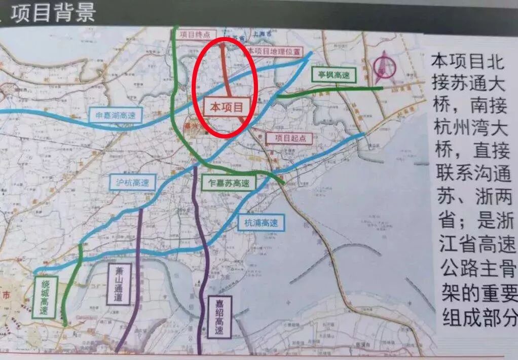 2016年7月,杭州湾跨海大桥北接线二期工程正式开工,总投资56.95亿元,项目全长为27.543公里,起点是杭州湾大桥北接线一期工程与沪杭高速公路的步云枢纽,终点则是汾湖与摇篮圩间的苏浙两省交界线,六车道高速公路标准,设计速度为120公里/小时。