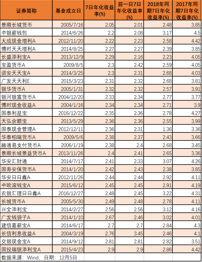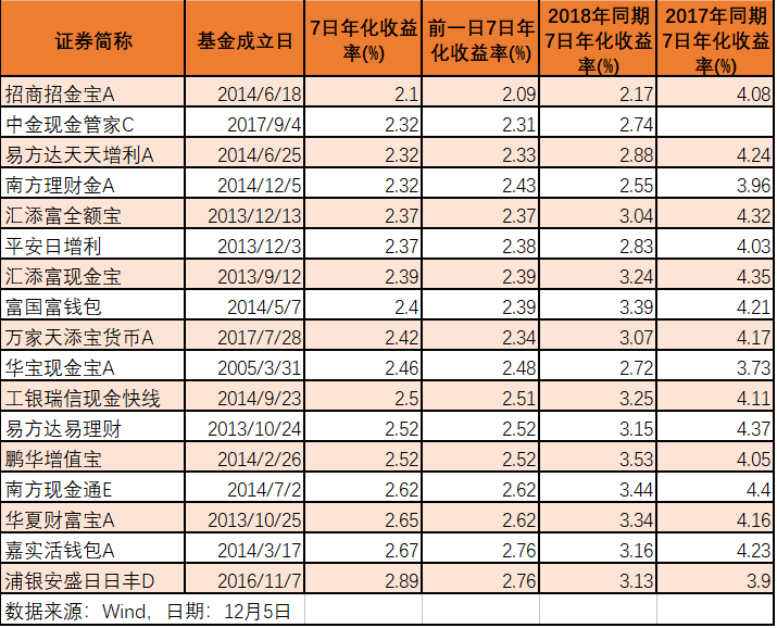 去年底,不少人在为货币基金收益跌破3%叹息,却没想到,今年可能连2%都难以保住。 作为拥有海量用户的两大移动支付平台,支付宝和微信分别设立了余额宝和零钱通,接入多只货币基金以满足用户的零钱储蓄需要。《每日经济新闻》记者注意到,随着货币基金收益的走低,余额宝平台接入的货币基金中已有产品最新7日年化收益率低至2.05%,零钱通旗下的也有货基最新7日年化收益仅为2.1%,距离跌下2%命悬一线。 货币基金收益降低的背后是利率的不断走低,零钱包货币基金带来的那份“稳稳的幸福”是否还在?作为投资者,哪些产品还能考虑呢? 两大移动支付平台旗下货基收益濒临破2% 移动支付平台的货币基金,曾是公募当之无愧的“顶流”明星,即便在当下,“粉丝”依然众多。对于货币基金,投资者憧憬的不是日进斗金的波澜壮阔,而是细水长流的“稳稳幸福”。然而,货币基金带来的幸福感正在与日递减。 虽然货币基金的收益从去年就开始陡降,部分货币基金甚至早早的就跌破2%,但那些货币基金产品毕竟在互联网平台之外,其中部分连续多年收益率垫底。早前就有业内人士指出,对于这些绩差的货基,没必要去关注。但是能被两大移动支付巨头看中,接入平台的这些货币基金显然属于优等生,但却已有跌破“2%”的危机感。 回顾过去两年,当前接入余额宝和零钱通的46只货币基金同期表现均不错,2017年12月5日的7日年化平均收益率为4.04%,2018年同期则是2.81%。然而至今年同期,却只有2.44%,不仅整体破3%,且超30只的7日年化收益率低于2.5%,要知道去年同期7日年化收益率低于2.5%的仅有2只。此外,12月4日收益数据表现令人忧虑,中银薪钱包、景顺长城货币A和招商招金宝A三只产品当日七日年化收益率均不超过2.1%。 华南地区某基金业内人士表示,货币基金收益下行和利率水平有关。他认为,中国利率水平趋势向下,是大势所趋,但并不至于零利率。“零利率很长时间看不到,毕竟中国经济增长还可以,需求还是有的。” 至于货币基金收益是否会继续下行,他认为“再下的概率很大,因为现在整体依然偏高。” 那么是否可能会破2%呢?好买基金研究中心研究员谢首鹏认为,“总体上,利率下行将使得货币基金收益下滑,但目前R-007中枢仍高于2.0,在2.4附近,且当前央行货币政策稳健中性,不会实施“大水漫灌”式刺激政策。截至12月6日,传统货币基金7日年化收益中位数为2.5%,尚有50BP空间,要大面积破2较难。” 稳健投资零钱还能往哪儿放? 有投资人士表示,国内利率或许走低,但却不至于“零利率”或“负利率”那么悲观。 从中长期看,谢首鹏认为,经济增速趋于下行,利率中枢也将逐步走低。“负利率的出现与经济增速和通胀水平高低联系紧密,现阶段国内经济增速仍远高于主要发达经济体,经济失速可能性小,也未出现明显通缩,未来几年出现负利率的概率较低。” 或许不至于零利率或负利率,但当利率走低,货币收益跟跌,投资者的钱还能往哪里投呢?某大型国有银行注册理财规划师认为,现在很多理财平台有:货币基金+债券基金的理财组合(货基、债基配比不同,预期收益分高低),这样的产品比较适合大家转移部分货基资金,稳健的同时分散风险,还能根据需求博取更多收益。同时,各家银行都有安全稳健收益相对较高的类货币产品,可做稳健短期零钱理财工具。此外,逆回购、银行T+0理财、短期理财基金都是不错的选择。 谢首鹏看来,在经济增速缓慢下行背景下,低利率将持续,除非出现经济过热,需要降温。在低利率甚至负利率区间,稳健型投资者可以考虑预期收益较合理的固收型产品,如理财、类货币管理工具、公募债券型基金等。不过,也有业内人士表示,低利率时代,该投货币基金的还是继续投货币基金。市场如此,高收益意味着高风险,并没有两全之法。 余额宝平台29只货币基金7日年化收益情况 零钱通平台17只货币基金7日年化收益情况