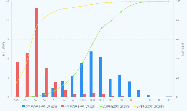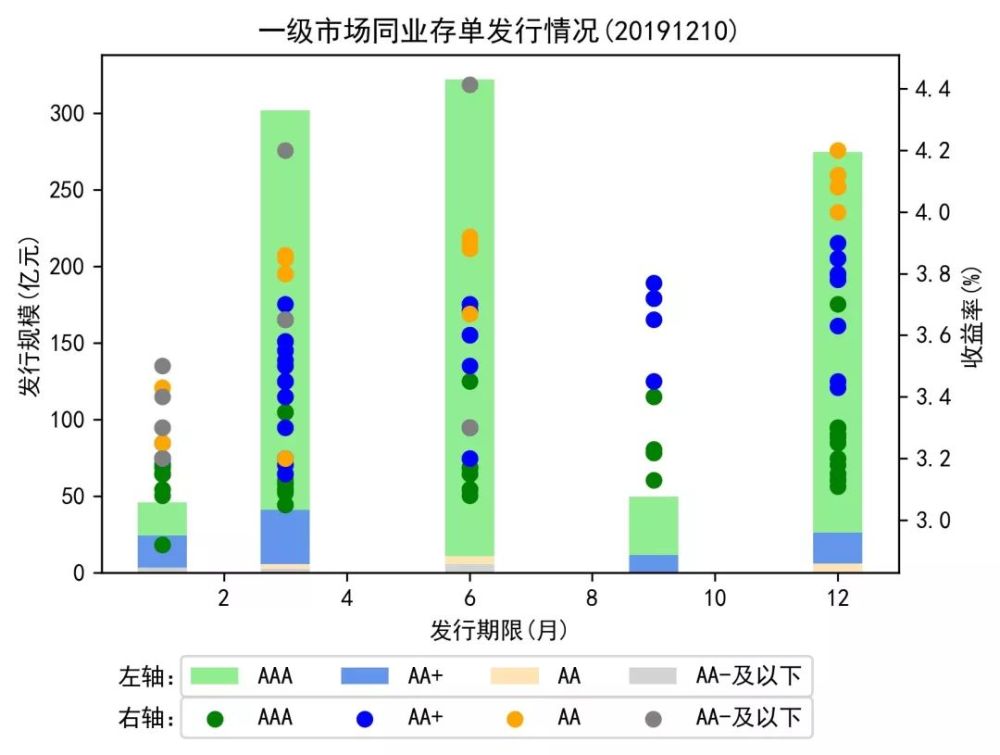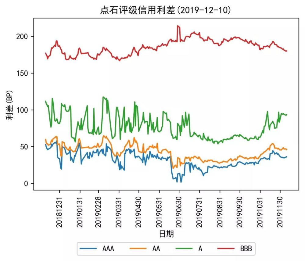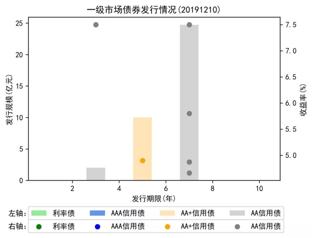《中国银行保险报》与点石金融科技共同推出“每日固收报告”,为您提供最新鲜的货币市场、一级市场、二级市场等金融市场数据。 市场综述 2019年12月10日央行继续公告不开展逆回购操作,当日无逆回购到期。国家统计局发布的最新数据显示,11月CPI同比上涨4.5%,涨幅较上月扩大0.7个百分点,高于市场预期,创2012年2月以来新高 PI同比下降1.4%,降幅比上月收窄0.2个百分点。 尽管CPI数据走高,但已有充分预期,市场有所回暖,国债期货全线上涨,现券市场收益率整体下行。 货币市场 公开市场操作:10日不开展逆回购操作,没有逆回购到期。 市场资金面宽松格局仍未改变,短期资金利率有所下行。银行间隔夜DR001下行14.05bp至2.1838%,DR007下行7.68bp至2.3724%。 数据来源:央行公开市场数据,点石金融科技 一级市场 数据来源:点石金融科技 二级市场 2年期、5年期、10年期国债期货主力合约分别上涨0.03%、0.09%和0.16%。长期利率债主力交易券种下行,10年国债190006下行0.5bp至3.195%,10年国开190215下行0.35bp至3.5825%,190210下行0.25bp至3.68%。 产业债方面,1年期收益率整体下行明显,5年期收益率整体上行。城投债方面,AAA和AA+级各期限收益率整体有所下行,AA级1年期和3年期收益率有一定上行。 数据来源:点石金融科技[1] [1]外部评级机构有:中诚信国际信用评级有限责任公司,中诚信证券评估有限公司,联合资信评估有限公司,联合信用评级有限公司,中债资信评估有限责任公司,东方金诚国际信用评估有限公司,中证鹏元资信评估股份有限公司,大公国际资信评估有限公司,上海新世纪资信评估投资服务有限公司(排序不分先后) 点石评级利差变化 *点石的主体信用评级符号与国际主流评级相同,由AAA到D分为17级,与中国现行的外部评级含义不同。 点石评级参考国际权威评级机构的评级模型,通过国际市场数据校准,并结合中国市场的实际改进,对国内发债企业进行信用评级和评分,债券评级参考主体评级。 点石评级分布以BBB为中心,BBB-及以上为投资级债券,BB+及以下为垃圾级债券。 截止目前,点石评级涵盖了18647家主体,各评级主体数目分布如下表: 点石评级信用利差:根据点石的评级对债券进行分类,计算与国开债收益率曲线的利差。