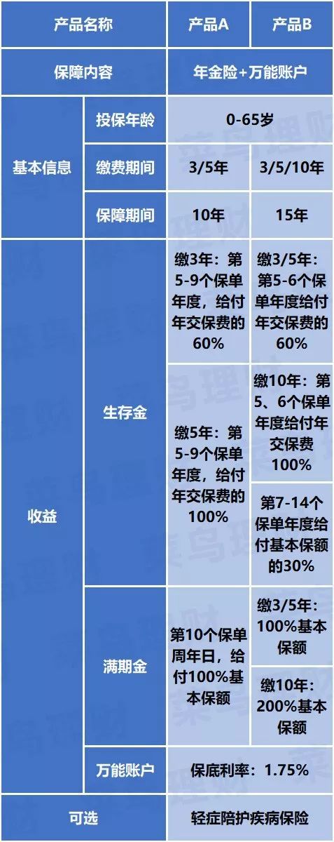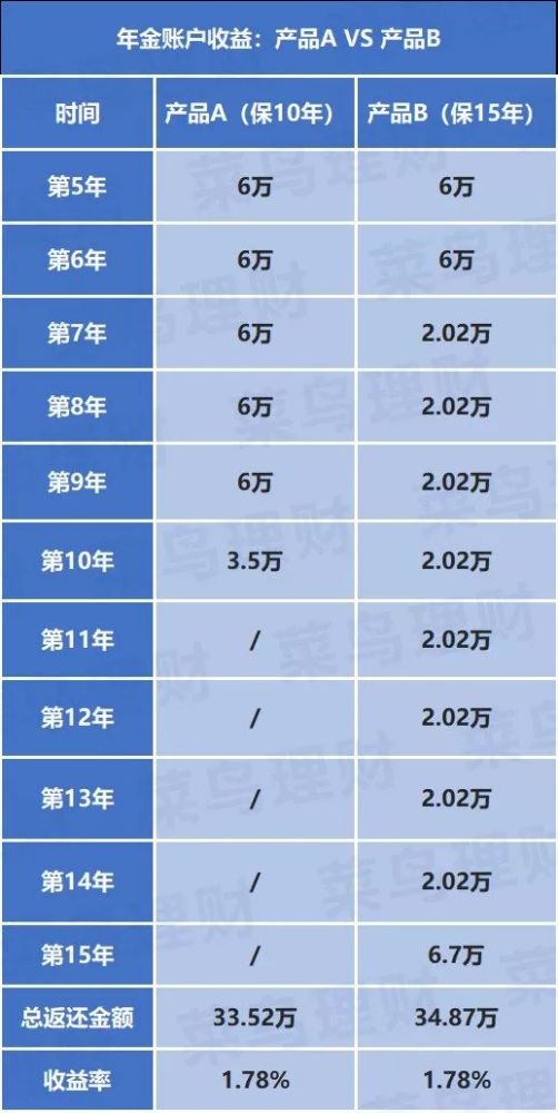 要问年金险是否足够优秀,拿起IRR这个照妖镜一看就知道了。 每到岁末年初,都是保险公司的年度盛宴开门红专场。 年关之际,讨个吉利,主推的产品一般都不会是和生老病死、人生无常相挂钩的重疾险、意外险、医疗险、寿险等保障类险种,而是一听让人觉得买了就会暴富的年金险。 最近就有很多菜友跑来问菜保,看了朋友圈里各家保险公司代理人的宣传广告,他们给出的开门红产品听起来都好诱人,值不值得买? 其中,菜友们问得最多的,就是某巨头的两款开门红产品,今天就来给大家聊一聊。 只不过,为了避免被巨头递律师信(已经收到过好几封了),我下面就不提这家公司的名字和具体产品的名字了。 1 必须承认的是,这两款产品的宣传文案看起来都让人非常心动。 各种彩虹屁吹得堪比保险界李佳琦,让人忍不住就想掏钱了。 好了,撇开天花乱坠的鬼才文案,我们一起回归产品本身,来看一下是不是真的这么牛: 这两款产品总体设计得非常像,简单来说,就是两个资金账户:主险年金账户+万能账户。 年金账户,就是以后会在约定年限返钱的账户,这个收益是固定的,约定好了这么多就是这么多。 万能账户,就是返还的钱不领取, 自动进入万能账户赚利息。 接下来,我们就分享看看这两个账户的收益怎么样。 2 先来看看主险年金账户。 要问年金险是否足够优秀,拿起IRR这个照妖镜一看就知道了。 假设30岁男性,每年10万保费,缴费期为3年,也就是共投入30万保费,从第5年开始返还,两款产品的具体返还情况如下图所示: 两款产品都是在第5年开始返还,产品A在第10年就结束返还了,总返还金额为33.52万。 产品B则是一直返还到第15年,连续返还11年,总返还金额为34.87万。 这是不是说产品B比产品A的收益要好呢?每年都有钱返还,返还时间更长,总返还金额也相对更多。 非也!你还得考虑到货币的时间价值!毕竟货币在不同时间,其价值是不同的。 举个栗子说,现在一下子给你100块,和把100块分为5年,一年给你20块。 虽然最后总额同样是100块,但这两个100块的购买力是不一样的,这就是货币的时间价值。 因此,年金险的收益高不高,不是光看总返还金额的大小就简单粗暴下定论。 而经过菜保测算,实际上,两款产品的年金账户收益率都只在1.78%左右。 没错,再强调一次,收益率1.78%左右,和同行产品的预期收益相比,略显惨淡。 不过也别急着骂娘,我们再来看看万能账户的收益能不能给产品加加分。 所谓万能账户,可以简单理解为一张银行卡,返还的钱如果不取出来,可以进入到万能账户“牛气X”(这个也是我修改脱敏的名字,别较真)上进行二次升值,赚取利息。 既然是存钱,那我们当然要关心利率的问题。 万能账户一般都是有保底利率的,无论保险公司的投资收益亏成啥样,都必须按照这个保底利率来给投保人相应的回报,这是保险公司给投保人的一个最低承诺。 菜保看了一下合同,“牛气X”的保底利率是1.75%,而保证利率之上的投资收益是不确定的,所以这个收益会存在一定的波动性。 因此,虽然目前给出的现行利率是5%,但不代表以后的实际结算利率也是5%。 上周五菜保已经解释过了 ,现在全球经济整体都不咋地,利率下行已经成为一个大趋势。 由于保险的投资选项相对保守稳健,万能账户的利率也很难摆脱经济周期的影响而有啥“逆天”的表现。 如果全球利率进一步下行,万能账户的收益必然不会好看到哪里去。 所以,线下业务员按高档利率给你测算的可观收益,最终能兑现多少,你就自己掂量看吧。 退一万步来说,先不纠结这以后还不确定的收益,就只看这个1.75%的保底利率,和同行产品比起来,其实并没有优势。 菜保随便找几款,万能账户的保底利率都能做到3%。 保底利率的高低,就是一个定心丸,甭管以后经济形势怎样,反正人家给了一个态度: 以后市场行情再不济,你也起码能得到这个保底利率。 更何况,大家买年金险本来图的就是稳定,想赚个稳妥的一定能到手的钱。 因此,选个保底利率更确定的,会优于挂钩万能账户、分红账户,用高收益率画大饼的产品。 3 最后再来看看可选责任:轻症赔付疾病保险。 按照这项责任的细则条款规定,如果在保障期内罹患合同约定的50种轻症,取【出险时万能账户价值—(万能账户趸交保险费+万能账户累计追加保险费)】和200万的较小值赔付。 是不是根本没看懂啥意思? 没关系,菜保告诉你这个描述里出现的3个比较明显的风险缺口: 1、这两个产品都是在第5个保单年度开始返还的,在此之前,如果你没有往万能账户里存钱,也就是万能账户价值为零,那么这段时间罹患轻症也就没有赔付金了。 2、从上面的计算公式可以知道,轻症理赔金额是不确定的。 3、轻症保障期限比较短。 主险合同结束时,轻症保障就没有了,甚至有可能主险合同都还没结束,轻症保障就已经没有了。 因为根据产品资料的说法,5年为一个保证续保期间,每个续保期满,需重新投保,如果产品停售了,就不再接受投保申请。 也就是说,这份附加险的保障时间,有可能比想象中还要短。 因此,考虑到以上3点风险,无论你是否已经配置了重疾险,菜保都不建议你附加这项可选责任。 如果你已经配置了重疾+中症+轻症的重疾险,那就没必要再花这个钱去附加这项可选责任。 而如果你还没有配置重疾险,想要把这项附加险作为一个暂时性的保障,就有两个潜在风险: 一是如果你出险了,但病