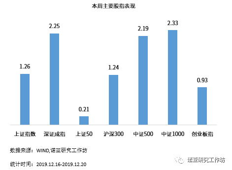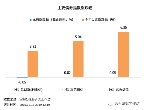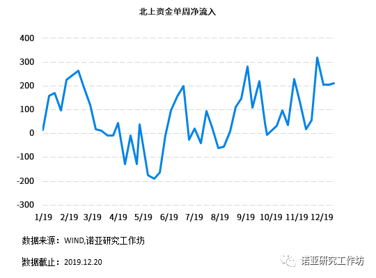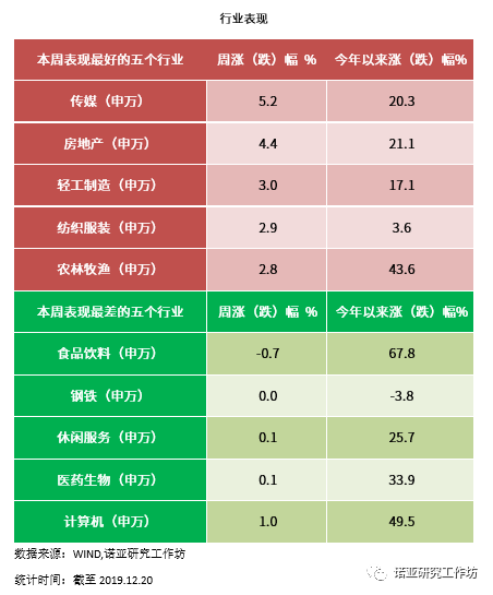 A股市场综述 本周北向资金净流入金额为212亿元,外资维持A股扫货节奏,已连续27个交易日净买入,增量力度不减,连续增持格力电器、中国平安超过10个交易日。 本周行业方面,影视及网络游戏板块强势发力带动传媒行业涨幅居前;在中央经济工作会议定调后,本周房地产开发板块带动整体房地产行业连续上涨,本周涨幅位居其次;轻工制造、纺织服装等出口型行业受到中美贸易利好消息影响同样涨幅较大;农林牧渔行业则在周二猪肉股再度强势的带领下扭转上周下跌情况,本周涨幅排名第五。 下跌行业方面,食品饮料行业继续维持下跌趋势,成为本周唯一下跌的行业,其中贵州茅台及五粮液为代表的白酒板块继续估值修复,重庆啤酒、青岛啤酒则带动啤酒板块整体下跌较大。 债市行情 货币市场方面,为维护跨年流动性平稳,央行加大公开市场操作力度,不仅超额续作到期MLF,还连续展开逆回购操作,周内净投放近5000亿,资金面持续宽松。资金面的宽松并没有给债市带来提振,做多情绪依然谨慎。受中美贸易阶段性协议达成和高层不断释放的“保增长”信号影响,中长端利率均有不同程度上行,仅短端利率小幅下移,信用利差被动小幅收缩。 随着中美达成阶段性的贸易协定,市场面临的一大不确定性消失,这或将在未来一段时间提升金融市场风险偏好。本月重要经济金融数据均已披露,接下来将进入数据真空期,前期数据显示出的经济回暖信号或将持续发酵,长端利率或有持续回调的可能。 商品行情 本周南华商品指数小幅收涨,各板块涨跌不一。其中:焦炭和原油价格上涨带动能化板块连续走强,为本周趋势性最强的板块,上涨1.7%;特朗普遭弹劾政治性事件形成一定不稳定风险,支撑金价,贵金属板块震荡上行,本周上涨1.4%;受供给增加影响,白糖价格走弱,对农产品板块造成拖累,振幅加大,微涨0.1%;前期大幅上涨的铜和螺纹钢出现回落,导致金属板块整体收跌。 中美贸易缓和利好全球经济复苏和原油需求,油价底部支撑增强。但另一方面,非商业空头持仓目前已降至年内低点,未来空头持仓量上升可能性较大,再考虑到利好消息频频落地,需要警惕短期内油价回落风险。