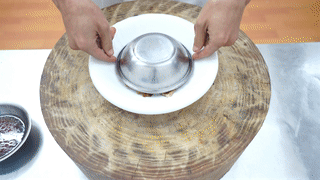 【29】然后下一步开始放入蒸锅,蒸锅上汽之后转中小火蒸2个小时,这一步的目的是将咸烧白蒸至入口即化,2个小时之后取出倒扣在碗中即可出菜。