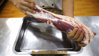 【2】下一块是猪外脊外层的肥油,也就是猪的背部肥油,通常来说猪的背部都会有印章,印章的内容是猪肉的省份和宰杀验收的时间,如果猪肉的背部没有印章则说明猪肉来源不明,下一步开始处理猪肉。# d6 r; A; N$ ]( @" w9 B3 E