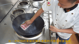 " n( W) V; K% W# O! j$ }【11】然后转中火将肥油炸至熟透飘起来,同学们切记不可炸太老否则食用之后容易上火,只需要炸至飘起来即可,肥油完全飘起来之后捞出备用,然后将热油倒出下一步开始炒制。