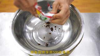 【15】趁这个时间开始准备辅料,准备宜宾芽菜500克备用,盆中加入清水清洗5遍之后捞出挤干水分备用,由于芽菜中含有大量的沙子所以必须多清洗几遍,不喜欢碎米芽菜的同学也可以用梅菜干代替。7 Q: J+ A) k8 \8 T7 j