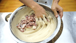 【26】猪肉切好之后放入盆中下一步开始调味,盆中加入调好的料汁将猪肉搅拌均匀,这一步的目的是将猪肉提前腌制入味。
