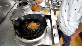 【10】油温烧热之后将准备好的肥油依次下入锅中。