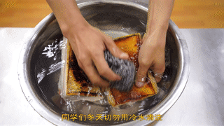 ( s4 }, U5 [* R4 j6 `# W【3】下一步开始处理,将烙好的五花肉放入温水中擦洗干净,同学们冬天切勿用冷水清洗# W$ S1 s* Q* M