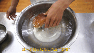 ) I6 h* f: {1 Y, L1 t+ q【14】炸至两分钟之后将肉捞出,然后放入温水中浸泡10分钟,这一步的目的是让肉皮“起泡”。8 k4 @" H% n3 a: |3 O