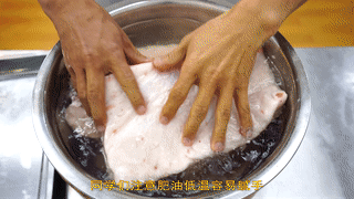 : o1 J7 t: T1 `/ q【13】油温7成热之后将准备好的猪肉皮朝下入锅炸2分钟,这一步的目的是将猪皮收紧炸黄,炸肉最好用长钩操作以保自身皮肤周全。