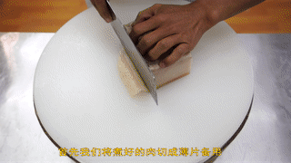 4 f/ l8 j( _9 A: z |【25】下一步开始处理猪肉,首先我们将猪肉切成厚薄均匀的薄片备用(约3.5毫米),怕油腻的同学可以切薄一些。 x+ `) K0 _% ?% ?+ R: g6 M
