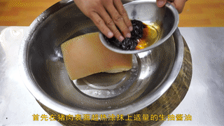 【10】首先在猪肉表面趁热涂抹上适量的生抽酱油,这一步的目的是给猪肉上色。2 p3 I; x. S' ]4 _& \; s