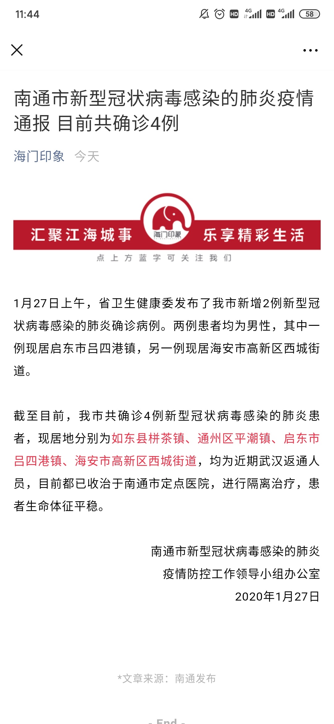 [新闻快讯] 南通市新型冠状病毒感染的肺炎疫情通报 |