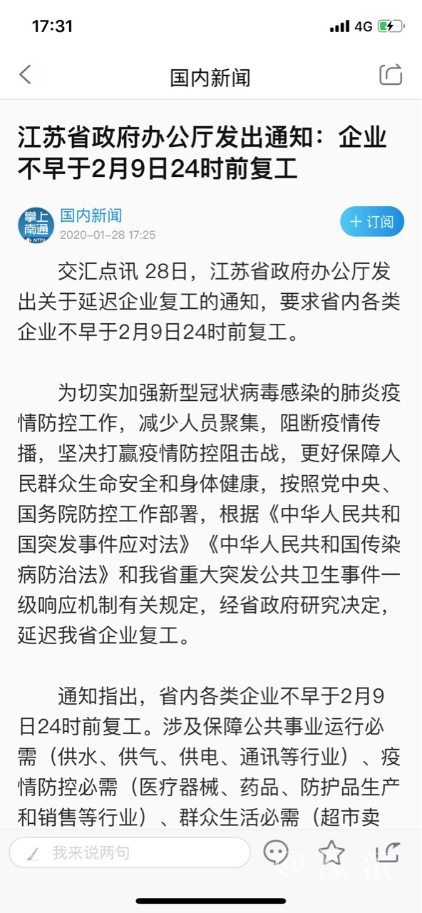 [新闻快讯] 江苏省政府办公厅发出通知:企业不早于2月9日24时前复工 |