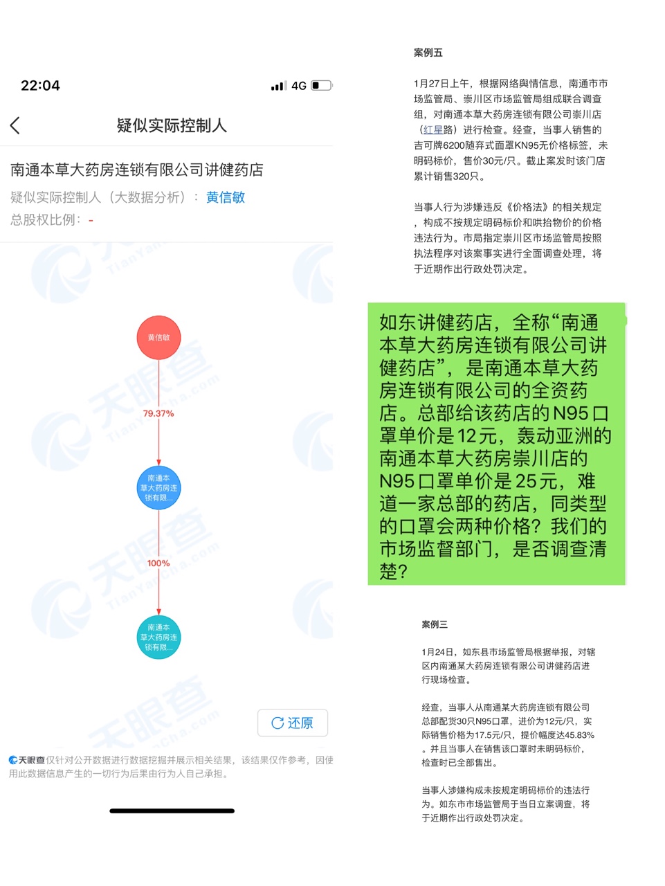 新型冠状病毒肺炎疫情发生以来,崇川区市场监督管理局按照区疫情防控指挥部和市局部署,迅速开展专项整治,保障公众身体健康和生命安全。 1月22日,崇川区市场监管局对全区328家零售药店进行价格和质量提醒告诫,要求各药品经营企业严格遵守《中华人民共和国价格法》、《产品质量法》等法律规定,严禁哄抬价格、囤积居奇、相互串通操纵市场价格以及销售不合格防护用品等违法行为,做到规范经营、诚信经营,确保市场稳定;指导药店积极向购药群众宣传新型冠状病毒疾病特点和预防、诊疗的相关知识,提高群众安全意识;督促药店做好发热病人信息登记和上报工作。 春节期间,启动执法应急响应机制,组建了执法小组,对各类涉嫌违法违规行为的经营者果断出击,第一时间开展检查,固定第一现场证据,及时查处。 1月27日上午,根据网络舆情信息, 南通市市场监管局、崇川区市场监管局组成联合调查组,对位于 红星路上的南通本草大药房连锁有限公司崇川店进行检查。发现当事人销售的吉可牌6200随弃式面罩KN95无价格标签、未明码标价,售价30元/只,累计销售320只。针对当事人涉嫌不按规定明码标价和哄抬物价的价格违法行为,已立案查处。