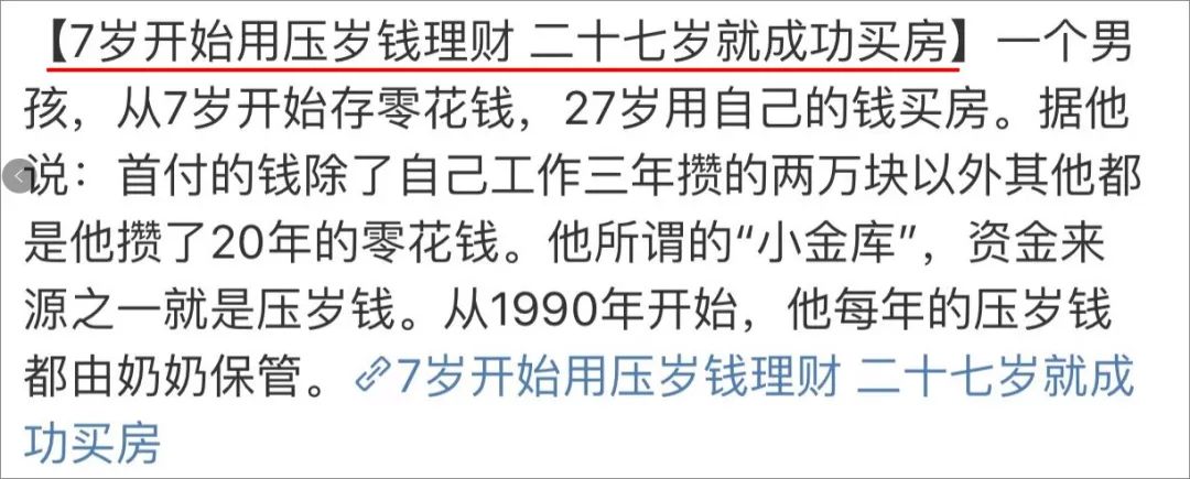 01 延长版的春节假期结束了,部分人今天已经反岗。 今年的春节假期是过得最特殊的一年,也是最沉重的一年。不过虽然人与人因为疫情隔开了,但爱并没有隔开。 大家在微信上远程拜年,在微信上给孩子们发压岁钱。 说起压岁钱,是我小时候过年最期待最开心的事。等待了一年,终于有了自己可以支配的零用钱。 可是,没想到啊,压岁钱还没在兜里揣热和,就被母亲大人强制收走了...... 小时候,我妈收走压岁钱的理由非常光明正大,充满正义。她说: “你还小,压岁钱放兜里容易丢,等你长大了,我就把压岁钱还给你......” 天真的我那时还真相信,等我长大了,我妈会把压岁钱给我。 盼望着,盼望着,我终于长大了,准备问我妈要存在她那里的压岁钱时。 我:“妈我想取点压岁钱买个东西。 ” 我妈:“不是早就给你花没了吗,你前几天买书包的钱,就是我用压岁钱给你付的!你上次买冰淇淋的钱,就是压岁钱。 ” 我:“妈,冰淇淋不是说你买给我吃的吗...... ” 02 不止是我有这么惨的遭遇,看完以下几件令人哭笑不得的事情,你会发现,几乎所有有压岁钱的孩子都曾被父母套路过,而这些套路其实让孩子们伤透了心。 有的父母怕孩子得到压岁钱后乱花,于是就骗孩子说: “你把压岁钱给我保管,等过完年再给你。” 孩子信任父母,把钱交上。但过完年后,父母却闭口不提压岁钱的事,当孩子问他们要时,他们又说开学再给,以此循坏,直到孩子不再提为止。 知乎上有一个关于压岁钱的话题讨论。其中一个网友的回答获得了无数人的点赞。 作者说,小时候得到压岁钱,父母总说帮他保管,开学后再给。但无数次开学后,他得到的回复都是等什么节日再给你。 重复几年后,他知道父母不会还给他压岁钱,对此,他无可奈何,但也不再信任父母。 除了不信任父母外,他也无法信任他人,而且经常怀疑他人,无法与人建立亲密关系,生活过得很糟心。 很多父母觉得,就因一个压岁钱,孩子就不再信任父母,这是什么道理,难道父母的养育之恩还抵不上压岁钱吗?父母收孩子的压岁钱,并没有错,孩子会得到压岁钱,也是因父母的关系。但给孩子承诺却不兑现,这种做法确实不妥。 卢梭曾说: 为人父母,师长者,只要有一次撒谎向孩子漏了底,就可能使他的全部教育成果从此为之毁灭。 孩子的对父母的信任是有底线的,你欺骗孩子一次,孩子的信任便少一次。 在《少年说》里,有个小女孩吐槽了妈妈拿她压岁钱后的所做所为。 她说:“每年妈妈都会把收到的压岁钱存到外婆那里。 ” 她一直以为,她存在外婆那里的钱会越来越多,但现实是等她去看存款时,发现钱越来越少。 一问外婆,才知道,妈妈把她的钱挪走了。 更过分的是,妈妈把她的钱拿去打麻将! 小女孩说,她以为妈妈拿钱是去办正事,但没想到是拿去打麻将。她每年辛辛苦苦存下的压岁钱,都被妈妈胡乱挥霍了,这让她很伤心。 有很多父母觉得花孩子的压岁钱是理所应当的,但他们却忘了孩子也是需要被尊重的。父母没有经过孩子的同意,就乱花他们的压岁钱,这无疑是在漠视他们的存在。 为什么现在孩子都不再听父母说话,最重要原因就是父母经常忽视孩子的感受和存在,所以孩子也要让父母感同身受。不要觉得孩子小,就好糊弄,老话不是常说人小鬼大吗? 今天你乱花孩子的压岁钱,将来孩子也会乱花你的钱,并跟你们一样毫不手软。 一个小女孩因压岁钱对爸爸进行了吐槽。她说把收到的压岁钱,放在自己睡的枕头下。但等她第二天起床时,就发现,压岁钱不翼而飞,她找遍了房间所有地方,都没发现。 但在爸爸的衣服兜里,她却发现了她装压岁钱的袋子,但爸爸并没有跟她说,这不就是在 “偷”她的压岁钱吗?她十分崩溃,躺在地上大哭打滚。 后来还是妈妈出来解围,说爸爸“偷”她的钱是去加油,好带她出去玩,她才停止了哭泣。 每年春节,都是见证亲情的时刻,这个小女孩的爸爸还只是“偷”。有的父母要是孩子不愿意给,会用言语威胁,对孩子说,“要是不上交压岁钱,爸爸妈妈就不要你了。”有的父母还会直接硬抢孩子的压岁钱。但用粗暴强硬的方式夺取孩子的压岁钱,只会让孩子觉得父母不爱他们,没有安全感。 03 很多父母之所以会套路孩子,就是怕孩子得到压岁钱后,随心所欲的挥霍,养成大手大脚花钱的习惯,所以很多父母宁愿伤孩子心也要收回压岁钱。 但没收孩子压岁钱并不是明智的做法,以下是给所有父母三点建议。 压岁钱该不该没收,每个人看法不一样。如果认为压岁钱本来就是人情往来的一部分,不属于孩子,那可以真实的告诉孩子,不要撒谎。但是建议还是给孩子一点压岁钱,当做过年的仪式感。 如果认为压岁钱就该留给孩子,但是又怕孩子乱花,想替孩子保管。那就要遵守承若,等孩子想要用这笔压岁钱的时候,如实归还。 否则父母就会在孩子那里失去信任。 反之如果父母遵守诺言,孩子感受到了承诺的力量,自然会信任父母,把压岁钱给父母管理,同时以后也会成为一个信守承偌的人。 想让孩子学会花钱,就该让孩子自由花钱,而不是把钱没收。因此,压岁钱最好还是每年给一部分让孩子自由使用。 当然在给孩子钱之前,也要给孩子一定的引导。比如可以让孩子列出如何花这部分压岁钱的计划,如果孩子的计划不合理,父母要和孩子商量,让孩子意识到如何花钱才合理。 这样既给了孩子尊重和支配权,又培养了孩子的财商,让孩子知
