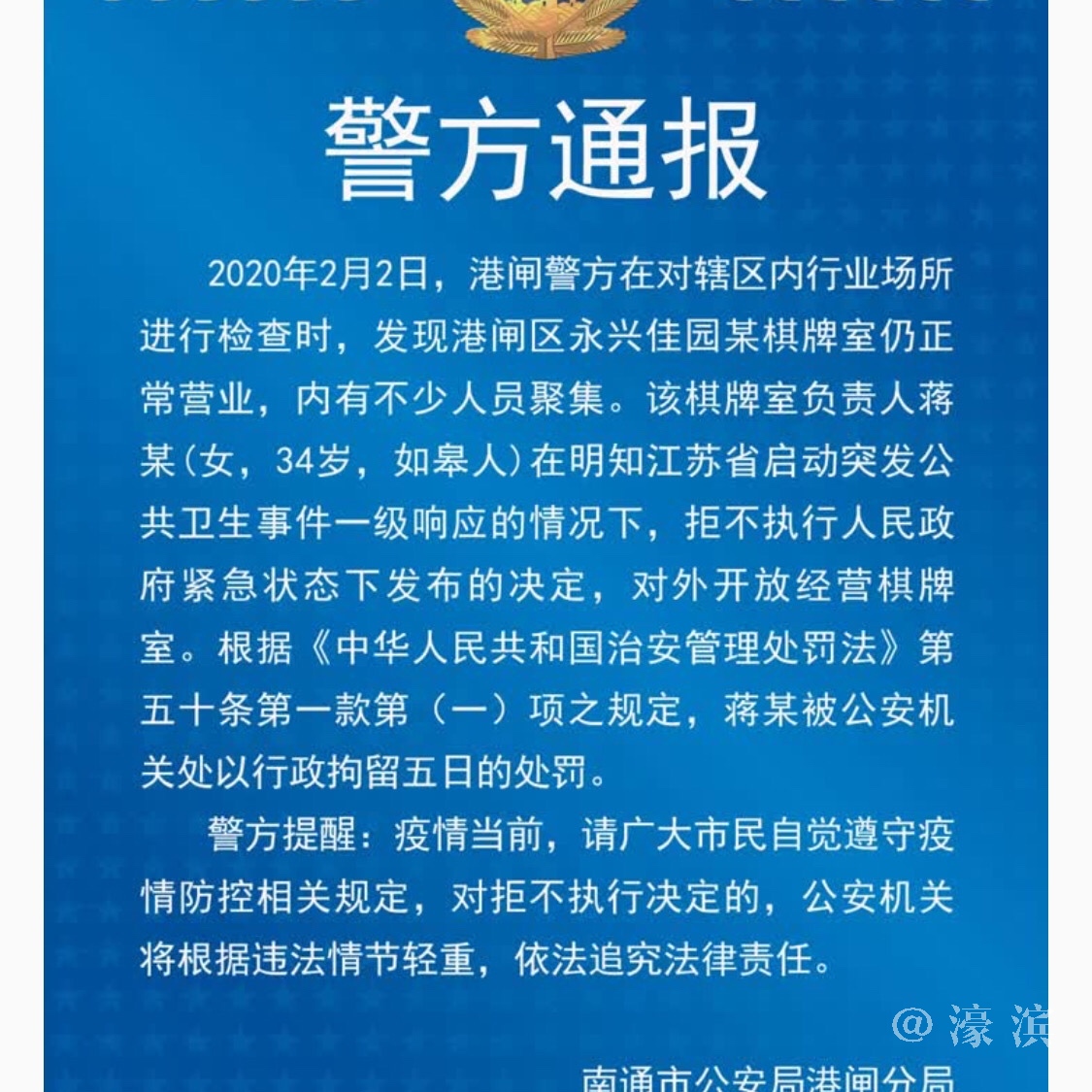 [新闻快讯] 南通一棋牌室拒不停业 负责人被拘留 |