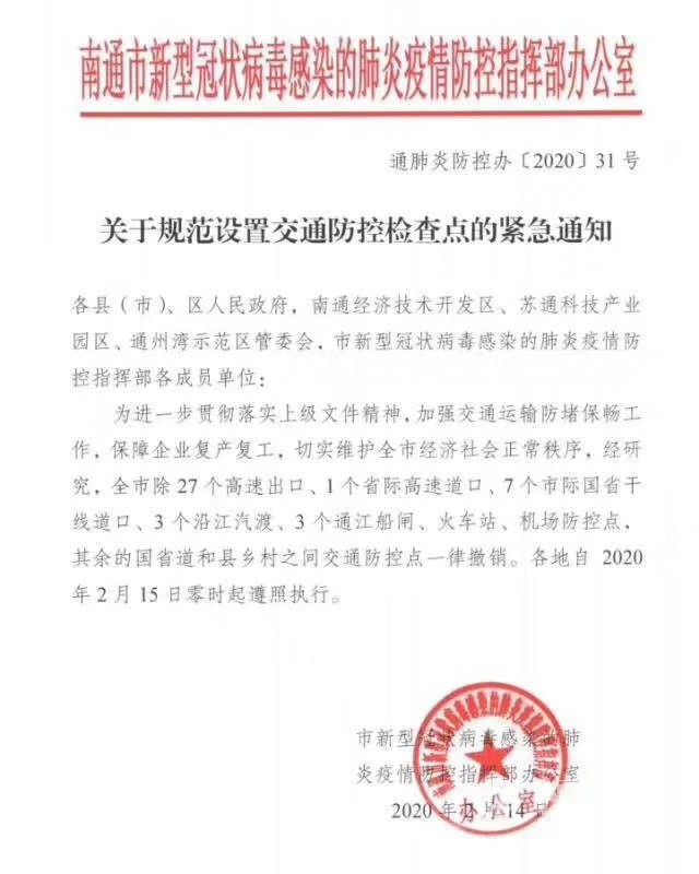 [新闻快讯] 2月15日起,南通地区将撤销部分交通防控点 |