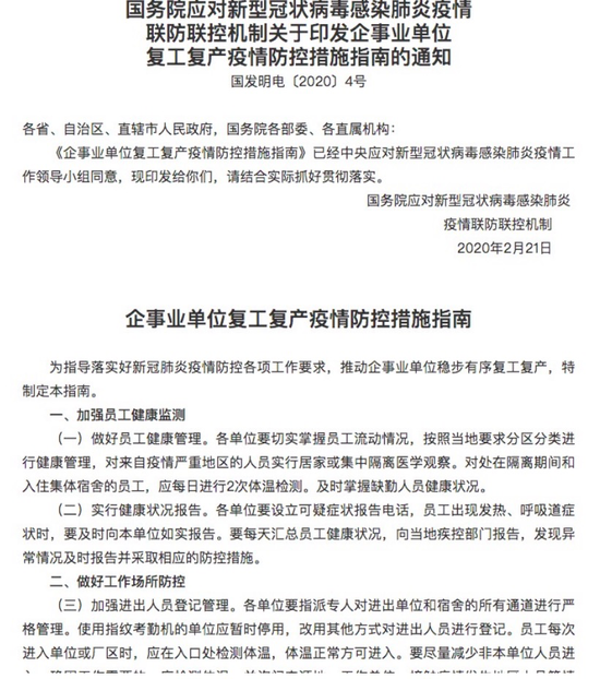 国务院应对新型冠状病毒感染肺炎疫情 联防联控机制关于印发企事业单位 复工复产疫情防控措施指南的通知 国发明电〔2020〕4号 各省、自治区、直辖市人民政府,国务院各部委、各直属机构: 《企事业单位复工复产疫情防控措施指南》已经中央应对新型冠状病毒感染肺炎疫情工作领导小组同意,现印发给你们,请结合实际抓好贯彻落实。 国务院应对新型冠状病毒感染肺炎 疫情联防联控机制 2020年2月21日