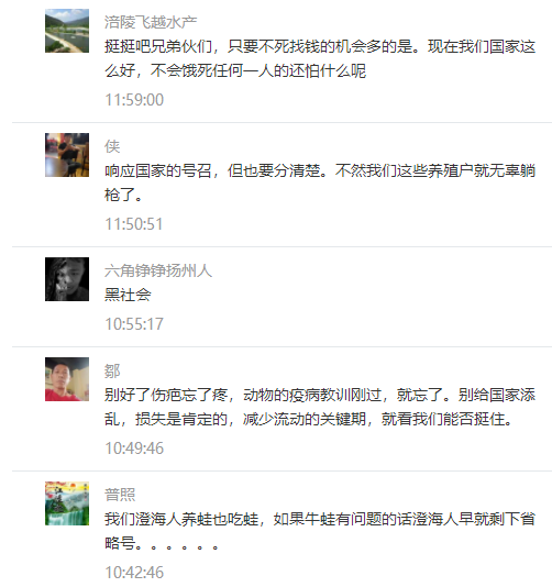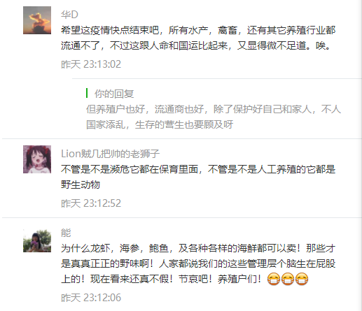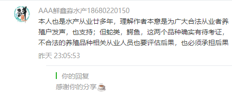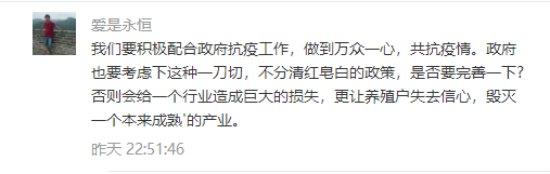 ) L% M B$ m" C R. A6 B! w【今日头条】水产专家紧急辟谣:粪便有病毒,不影响水产品消费!多吃鱼虾更健康! 综上所述,我们没有任何证据说明水产养殖动物能够传播新型冠状病毒,在这次疫情防控过程中,水产品多次“躺枪”对于水产养殖业者而言是很无辜的,也是不利于我国的水产养殖业顺利发展的。 部分网友留言 还有很多很多...... 转载声明 本文来源:腾氏水产商务网-当代水产华中农业大学 陈昌福,水产前沿整理自 中国经济网、 新华网广东频道、水产前沿、信宜市市场监督管理局,如需转载,请注明出处,如有版权问题或转载出处有误,敬请联系后台,我们会及时更改及删除。 恭喜发财 大吉大利
