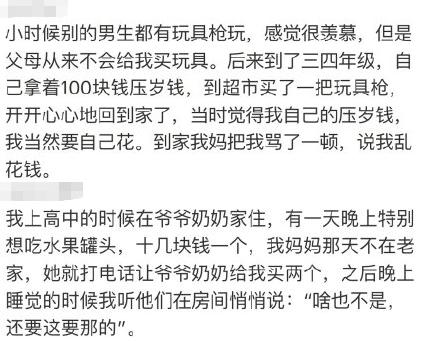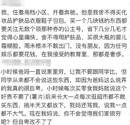 最近网上有一个话题引起了众多网友的共鸣,那就是"父母抠门会导致孩子自卑吗?" 那些被花钱的负罪感绑架的孩子,他们长大后人生里的"花钱、享受",都将与"负罪感"打包出现,不少网友用自己的亲身经历给出了回答: 有人小时候没有玩具特别想要,自己用压岁钱买被妈妈骂乱花钱,有人高中时想吃十几块钱的罐头,却被爷爷奶奶背后责备。 小的时候没有拥有,现在自己赚钱了就会报复性买买买,实际上自己内心也无比煎熬。 从小接受的教育就是不乱花钱,住豪宅开豪车也不舍得给自己买好点儿的护肤品,去超市买东西犹豫半天连妈妈都看不下去。 为了彰显自己家不是没钱而不给她买东西,孩子偷了妈妈5000元钱放同学面前。 事实证明,父母对金钱的态度真的会对孩子造成影响,这份对金钱的"负罪感"其实与节俭无关,它只是会让孩子更加害怕金钱,对于花掉的每一分钱都忐忑不安。 "穷养"孩子不仅让孩子小时候的心理受到伤害,也让他们成年后不懂得如何管理财务,甚至让他们不懂得享受生活。"穷养"孩子不单单是指在金钱上管制孩子,更重要的是这些行为让孩子在精神上受到了限制。以下这些行为都是不可取的穷养: 1.在孩子面前哭穷。有的家长为了让孩子养成节俭的习惯,会以"没钱""这个很贵""买不起"等理由来拒绝孩子的购买需求,一方面会让孩子觉得自己家境不如其他小朋友,另一方面也会让孩子觉得自己不配拥有。家长客观对待孩子的需求,既不能无休止的满足孩子的需求,也不能用"哭穷"的方式拒绝孩子,如果一定要拒绝,请用"事先没有计划,这次没有预算"等之类的客观理由。 2.经常对孩子诉苦。很多父母为了养家糊口辛苦地工作着,担心孩子会攀比,想着提前给孩子打预防针,会跟他们说:"爸爸妈妈每天累死累活也赚不了多少钱,你要懂事一点,不要看别人有什么就要什么,我们这样的家庭不能跟别人比。"这样会让孩子对自己有欲望感到愧疚,甚至觉得自己的欲望是肮脏的。父母的辛苦,懂是非的孩子看得到。他们越能理解、体谅父母,父母更应该给他们更多的宠爱,让他们基本的欲望得以满足。 3.将自己与孩子区别对待,强调对孩子好。有些家庭条件确实不好,在孩子的请求下也会在不情愿下满足孩子的欲望,比如好吃的只买一点,然后给孩子吃的时候说:"这么贵的东西,我自己都不舍得,就买给你吃,看我给你多好!"这样孩子在吃的时候,背负的是愧疚与自责,好像犯了错误一样。 贫穷使得父母不得不在经济上约束孩子,但节俭绝不是吝啬、抠门。不管有没有钱,给孩子撒下美好的希望,使孩子精神上富足、拥有独立的人格,才能让孩子摆脱自卑、走向自信。 关于钱的教育从来都与贫富无关,聪明的父母,从不会用自己的付出和牺牲去"绑架"孩子,给TA建立一个健康的人格和心态,这才是最重要的