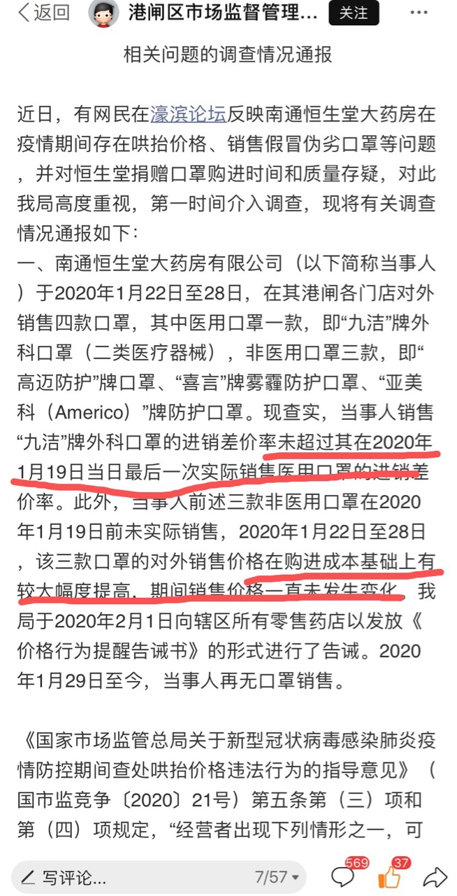 [百姓民声] 关于对网民反映南通恒生堂大药房相关问题的调查情况通报 |