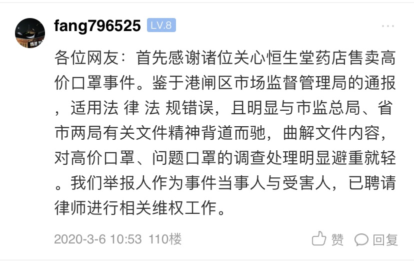 [百姓民声] 关于对网民反映南通恒生堂大药房相关问题的调查情况通报 |